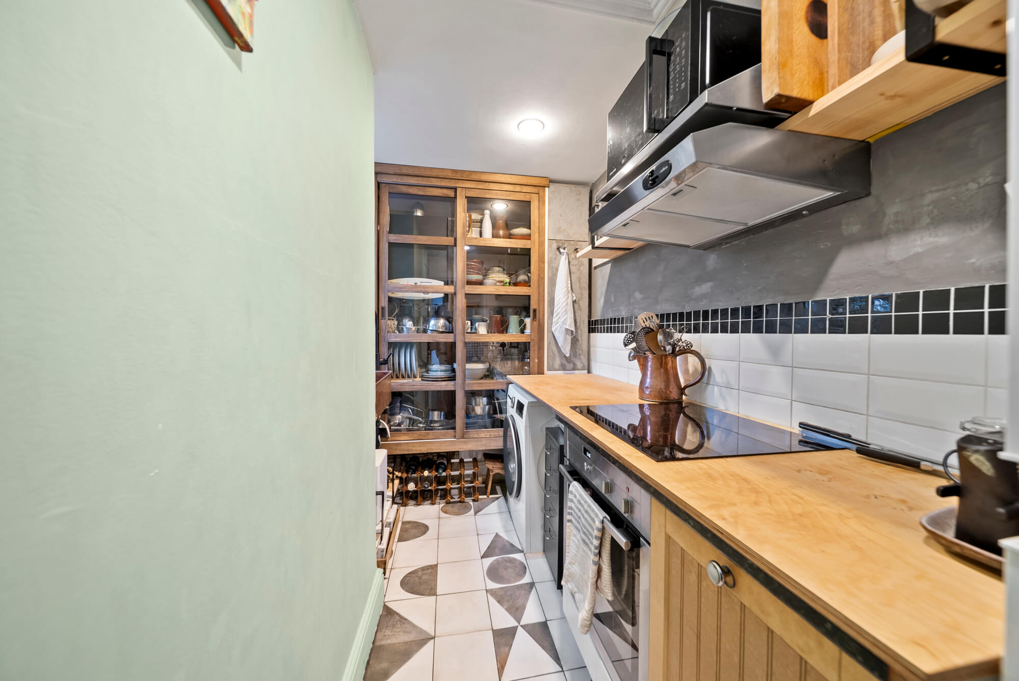 The reception room is light and airy, with space to relax and work comfortably day to day. A galley kitchen is neatly arranged and practical, with everything required for a short stay without unnecessary excess.