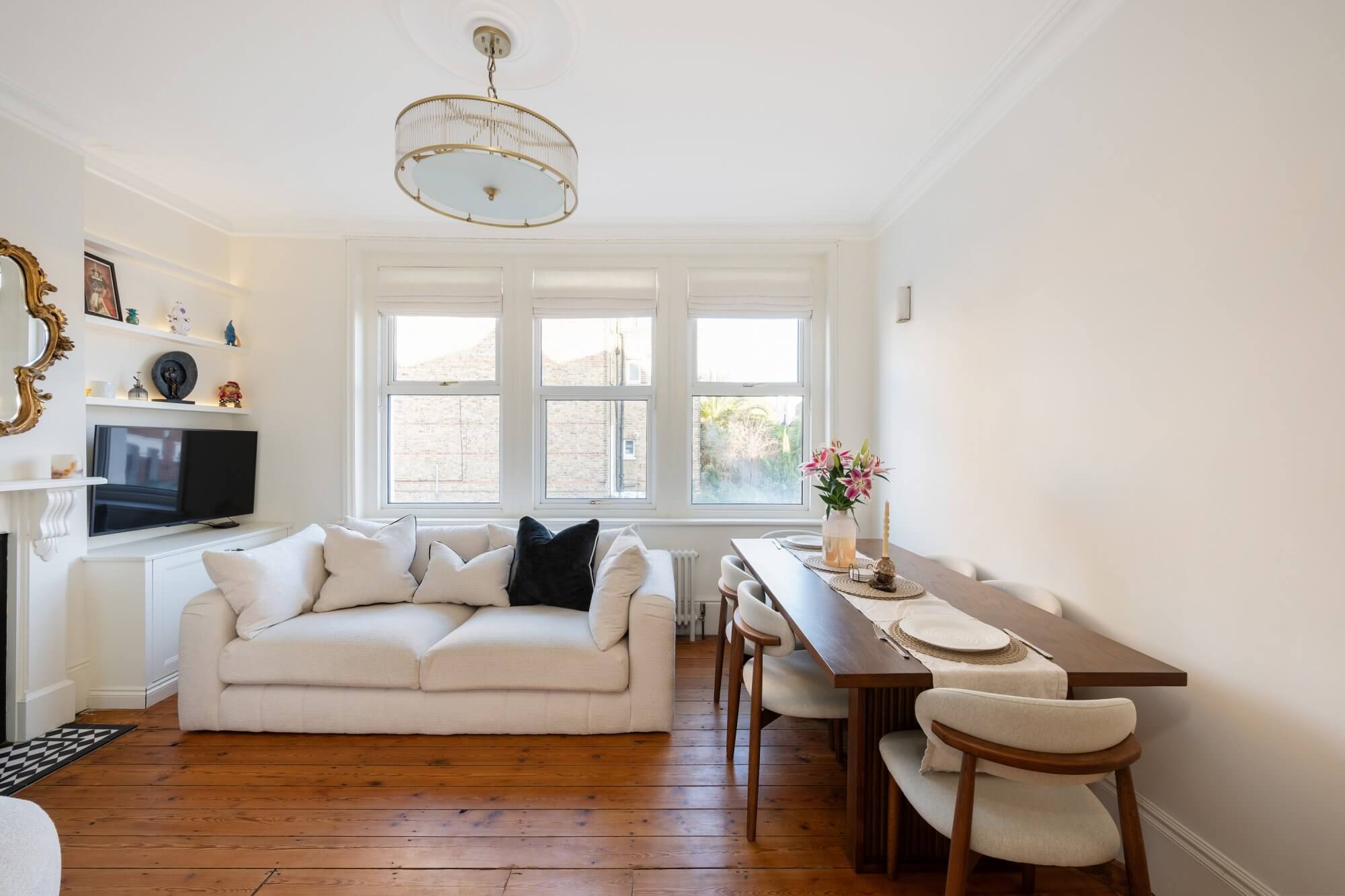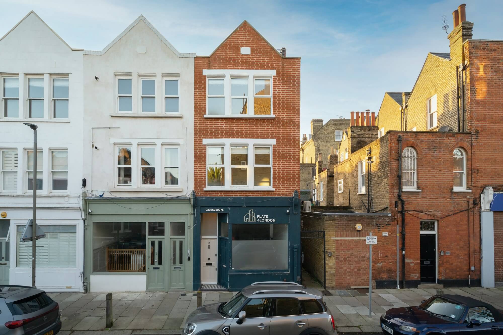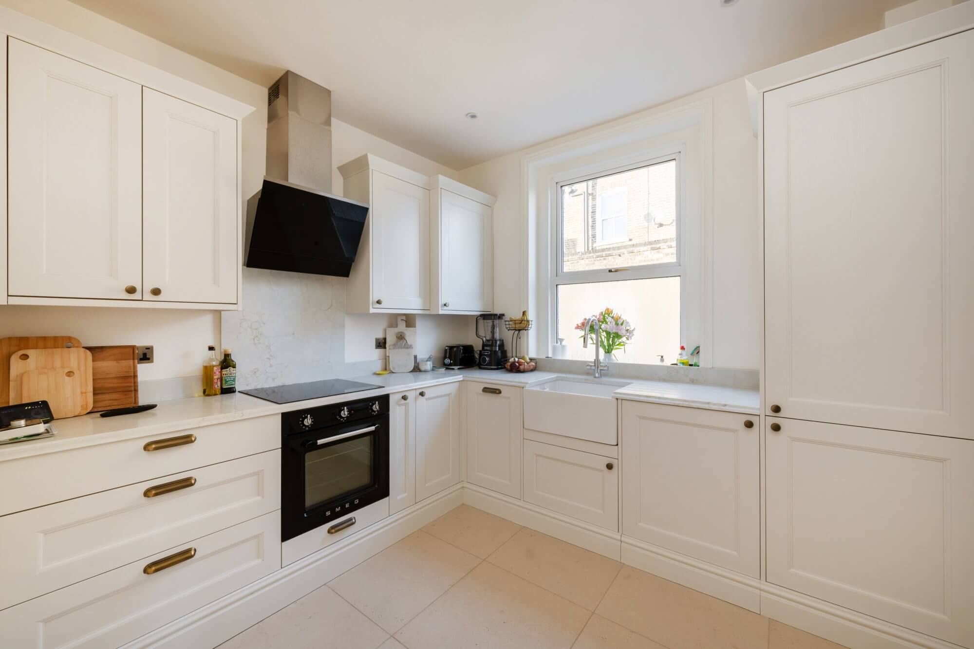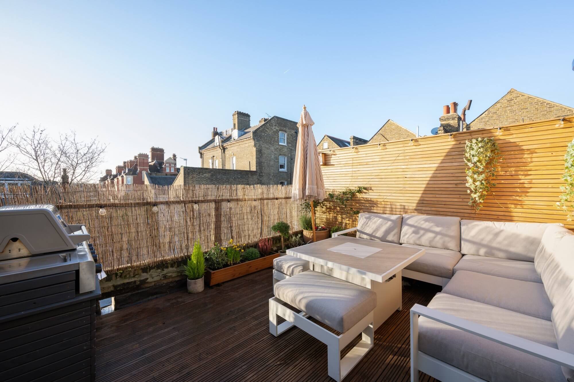 The spacious reception room at the front features a striking fireplace and offers ample space for a dining area, creating a warm and inviting atmosphere. The newly installed kitchen is a true highlight, designed with classic Shaker units, marble quartz worktops, limestone flooring, and fitted with high-end appliances for modern living. The accommodation includes a generous main bedroom with full-height wardrobes, complemented by two further double bedrooms, each with built-in storage. A luxurious shower room complete with marble flooring, a stone double basin, and underfloor heating. A standout feature of this home is the private West facing roof terrace, which enjoys uninterrupted sunshine throughout the day in summer, including the option to enjoy the sunsets throughour the summer months. Thoughtfully designed for comfort and convenience, it includes built-in wall lighting and power sockets, making it perfect for relaxing or entertaining.