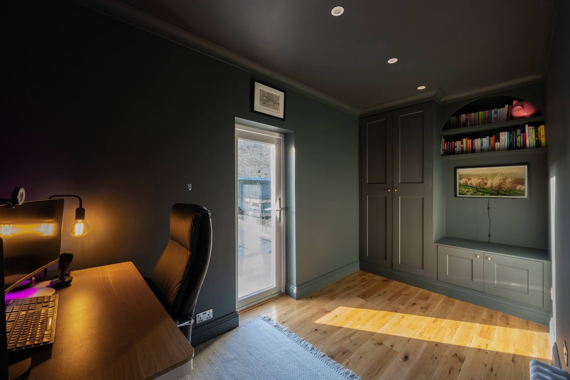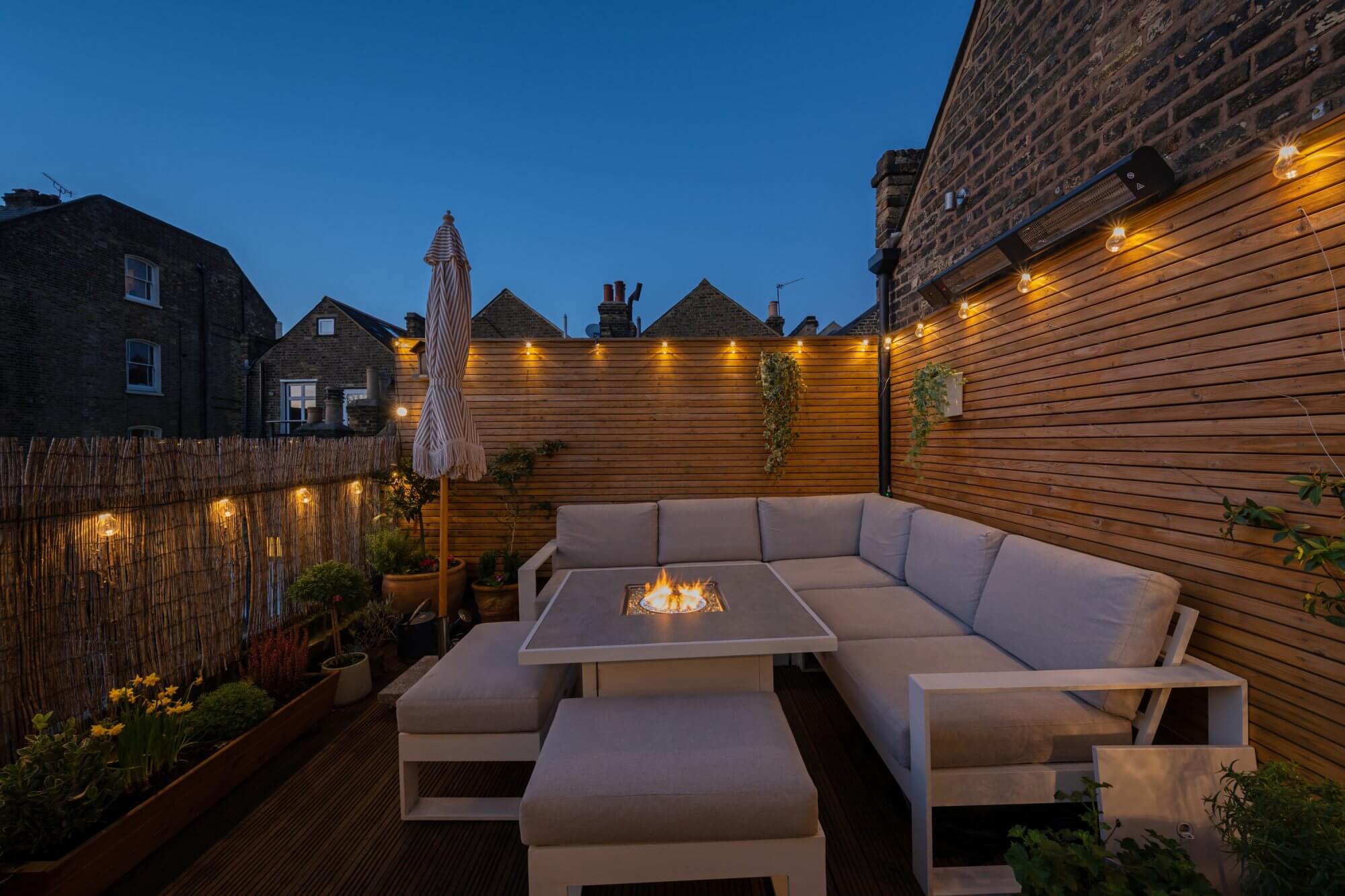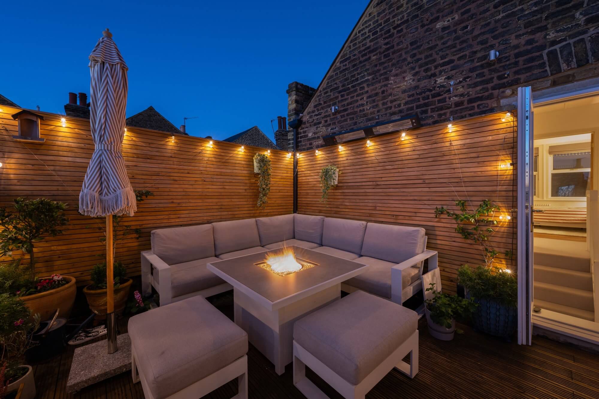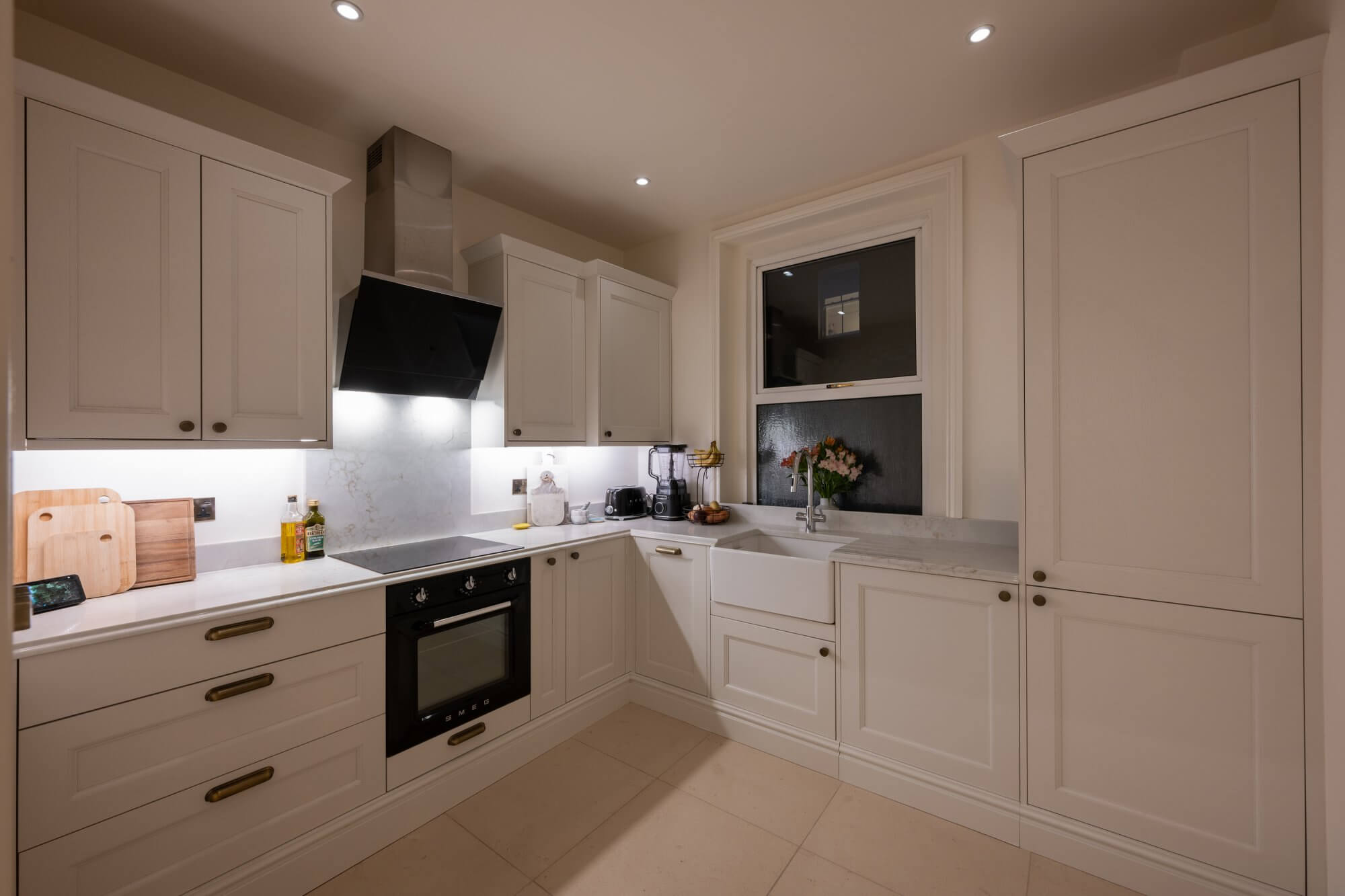 The spacious reception room at the front features a striking fireplace and offers ample space for a dining area, creating a warm and inviting atmosphere. The newly installed kitchen is a true highlight, designed with classic Shaker units, marble quartz worktops, limestone flooring, and fitted with high-end appliances for modern living. The accommodation includes a generous main bedroom with full-height wardrobes, complemented by two further double bedrooms, each with built-in storage. A luxurious shower room complete with marble flooring, a stone double basin, and underfloor heating. A standout feature of this home is the private West facing roof terrace, which enjoys uninterrupted sunshine throughout the day in summer, including the option to enjoy the sunsets throughour the summer months. Thoughtfully designed for comfort and convenience, it includes built-in wall lighting and power sockets, making it perfect for relaxing or entertaining.