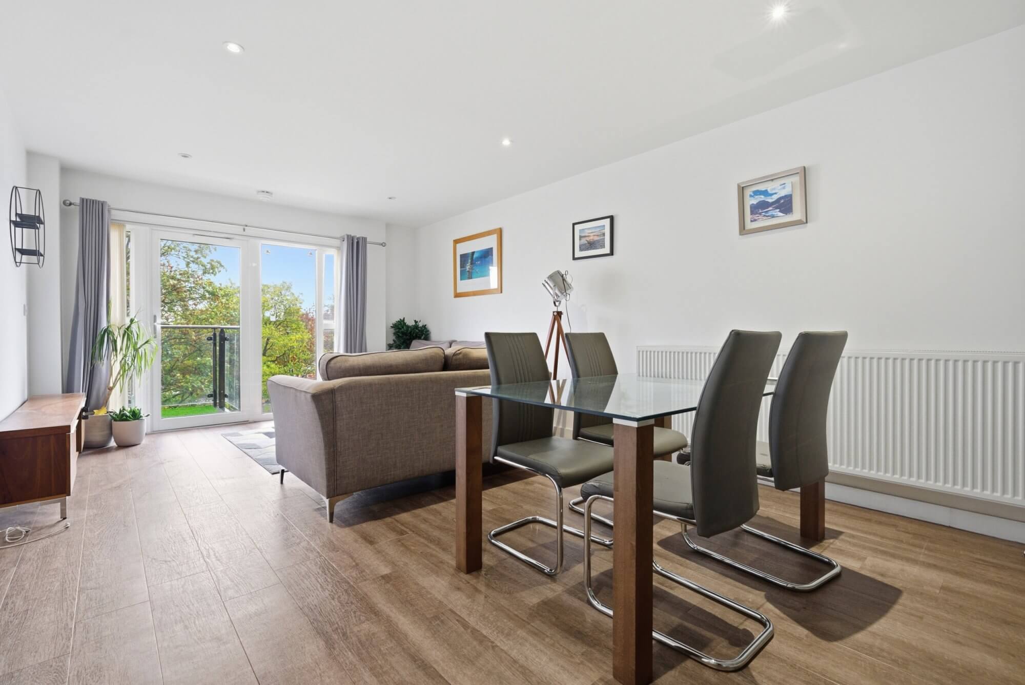 From the living room, doors open onto a private balcony — perfect for relaxing or entertaining. There are two generous double bedrooms, both with built-in storage. The main bedroom benefits from a stylish en suite shower room, while the second bedroom is served by a contemporary family bathroom. Offered furnished, this stunning apartment is ideal for professional sharers, a couple, or a small family looking for a modern home in a desirable location.
