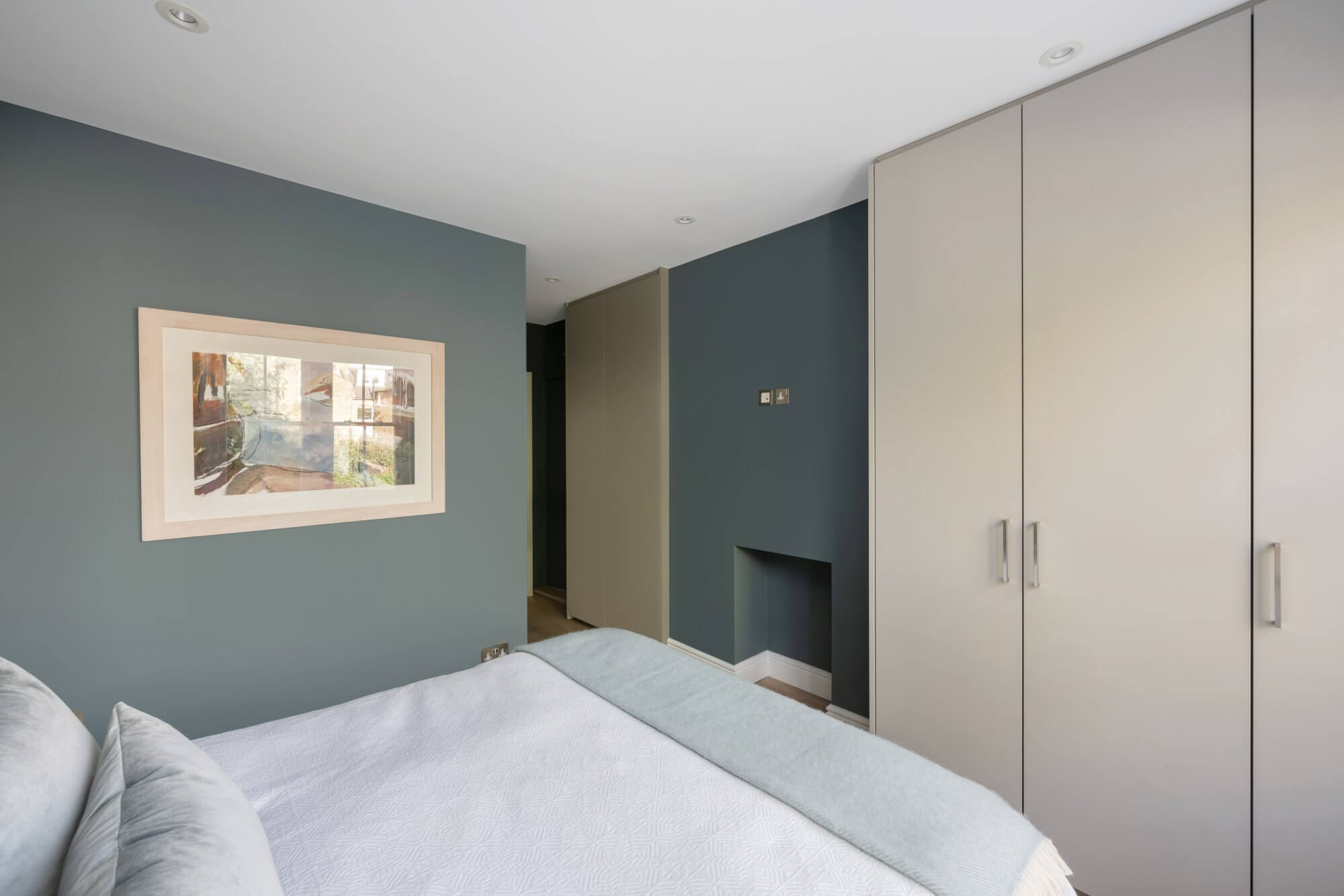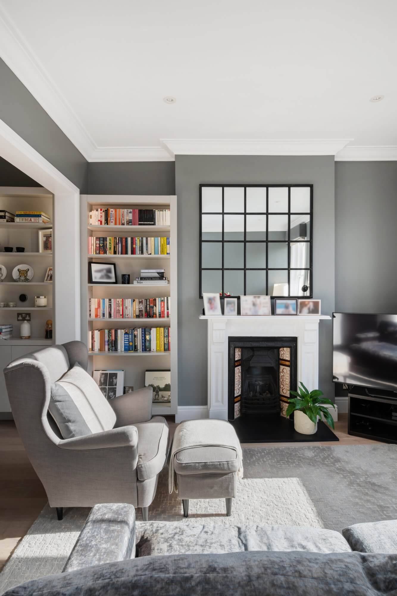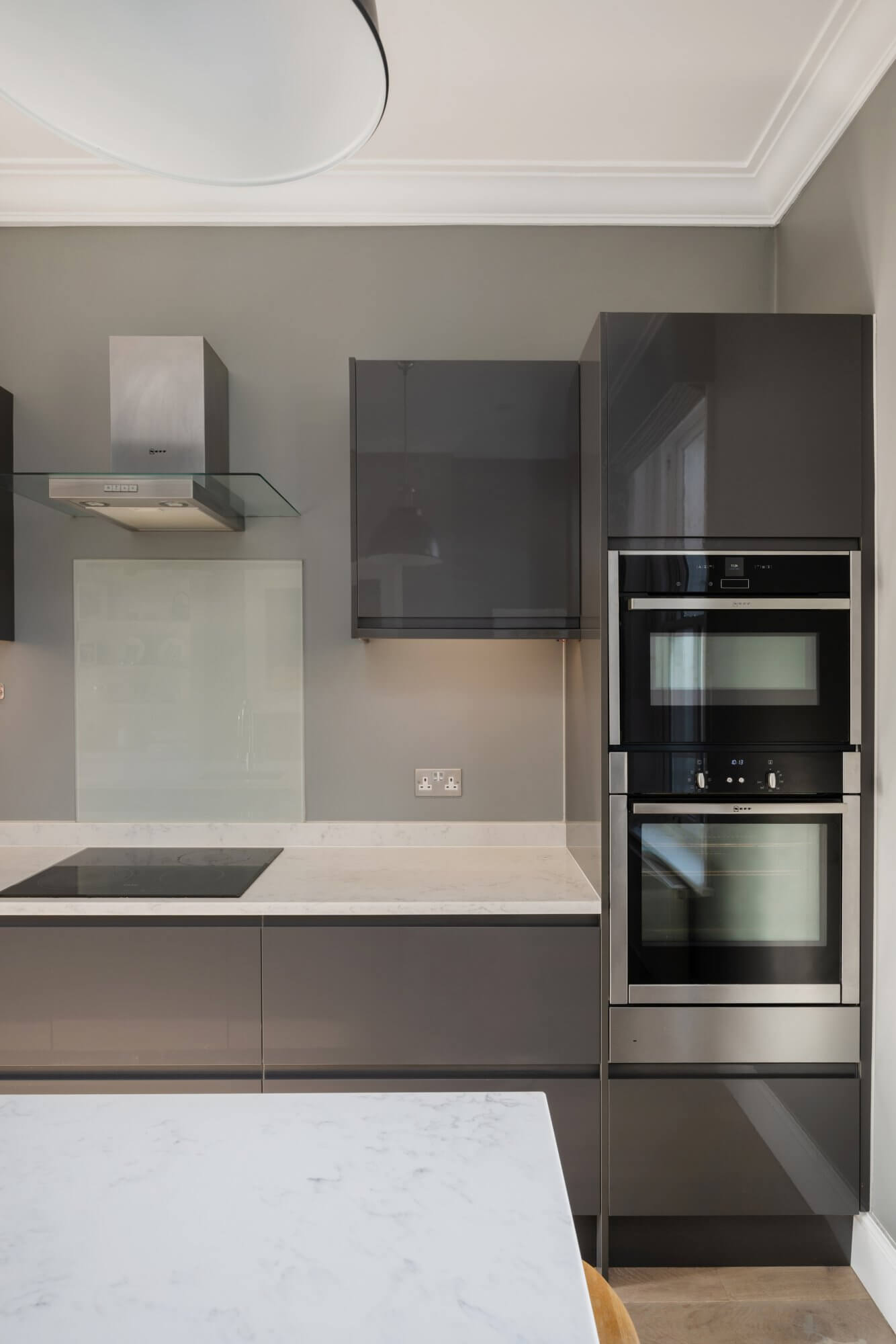 The main reception room is open plan, centred around a feature fireplace and arranged with clear space for both sitting and dining. The fully integrated kitchen is fitted with Neff appliances and designed for ease, with clean lines and considered storage. The layout works well day to day, while remaining elegant and uncluttered.