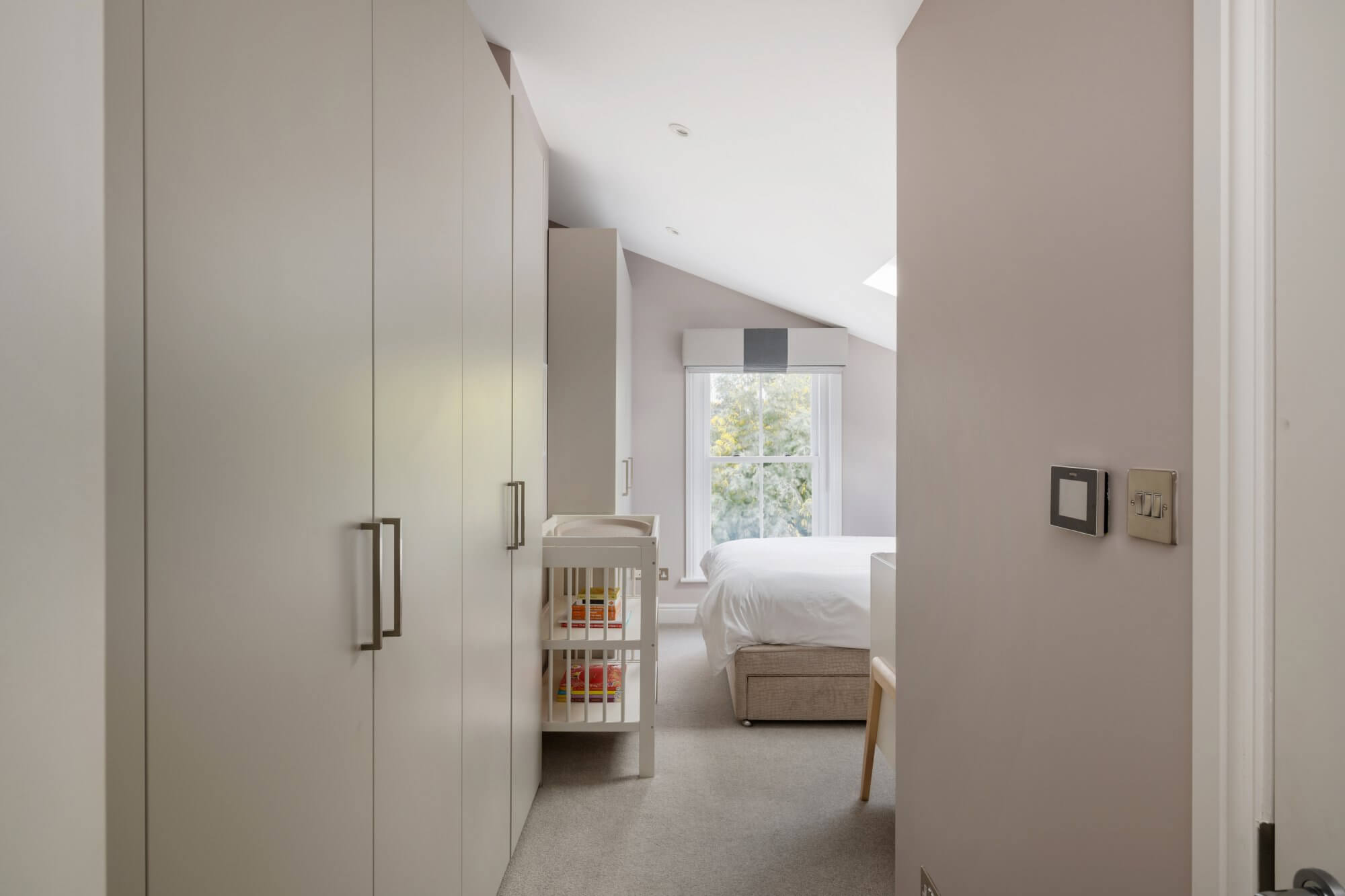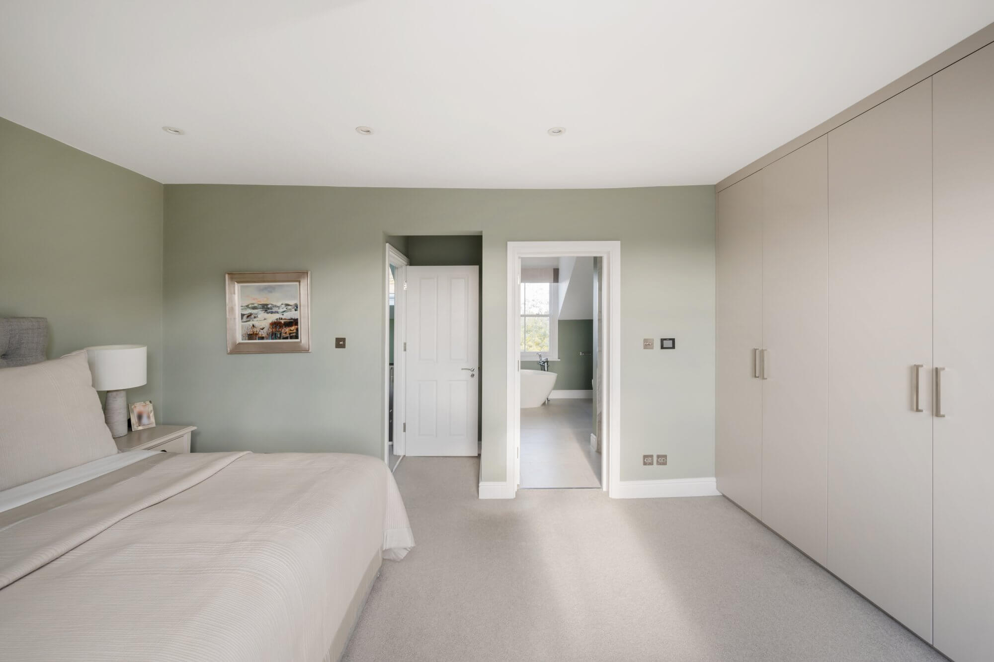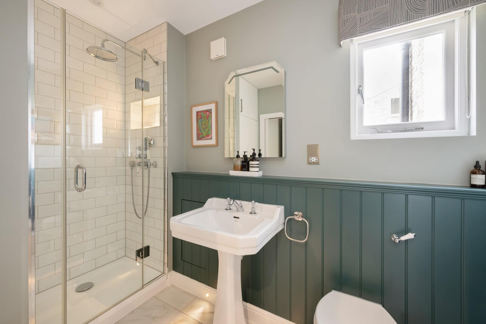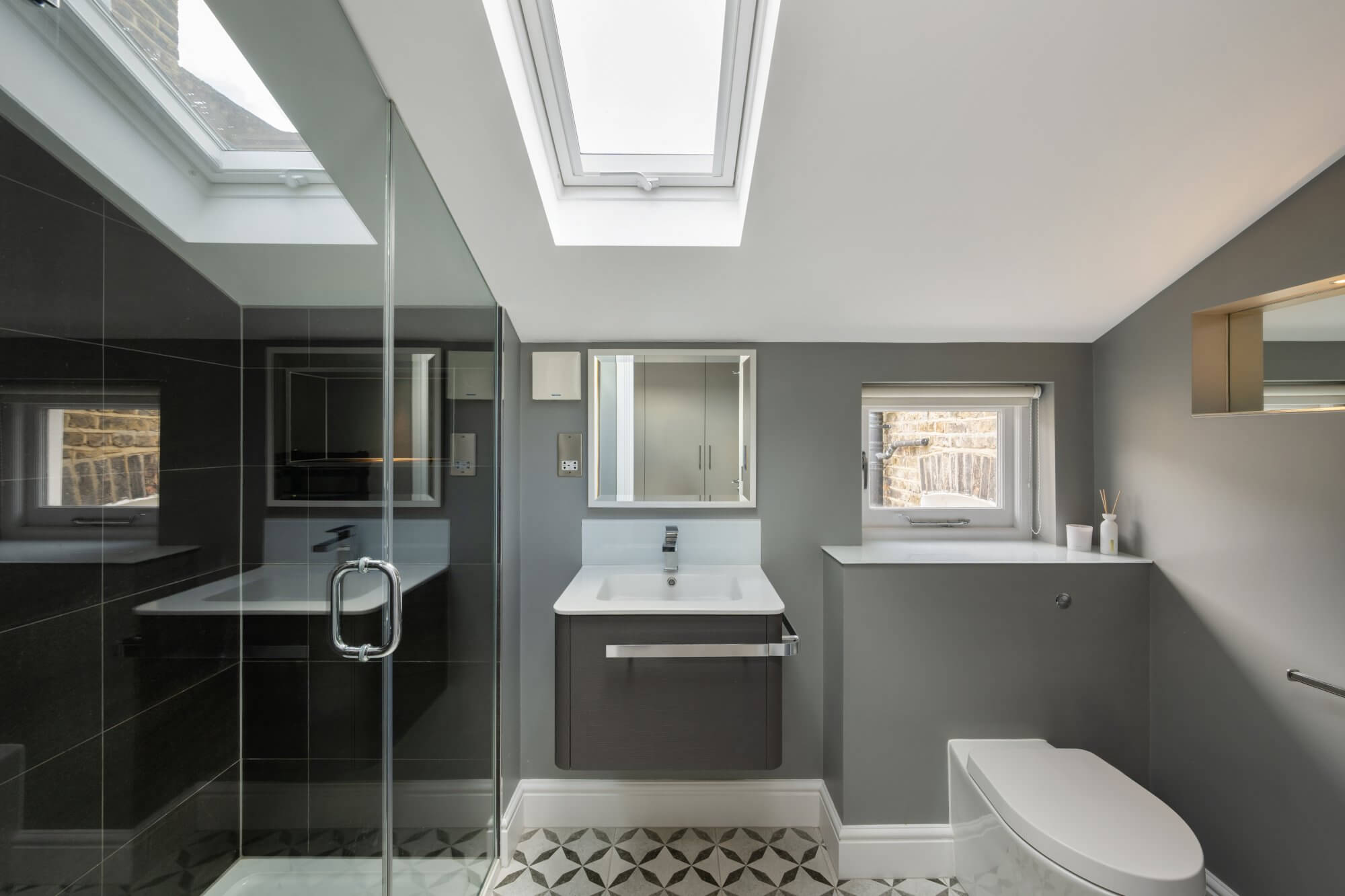 There are three generous double bedrooms in total. Two are arranged on the lower level, both with ample built in wardrobe space, one served by a stylish en suite shower room. An additional shower room also functions as a utility space, housing the washing and drying machines. The loft level is dedicated to a particularly spacious main bedroom, complete with extensive built in wardrobes and a luxurious en suite bathroom with double sinks, separate shower and roll top bath. All bathrooms are recently fitted and finished in a cohesive, understated style.