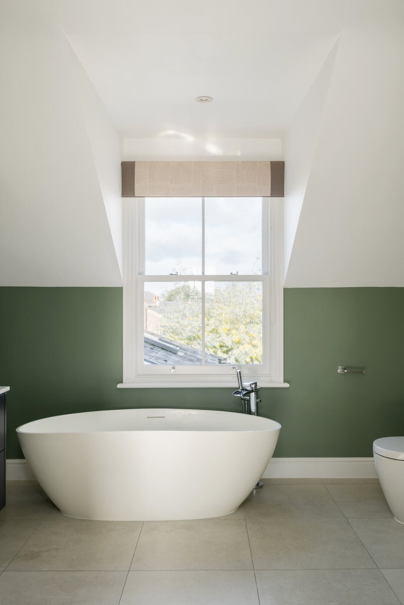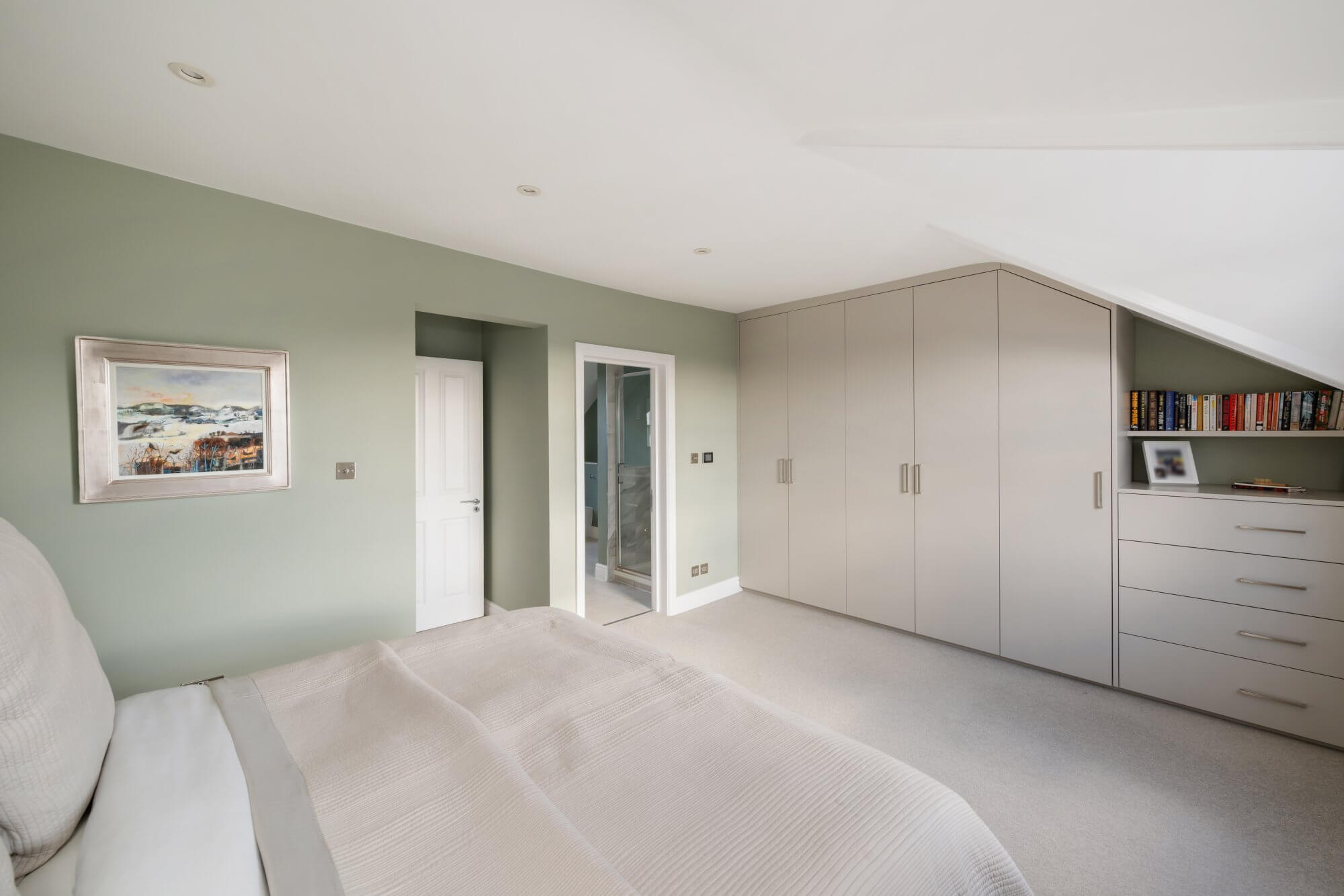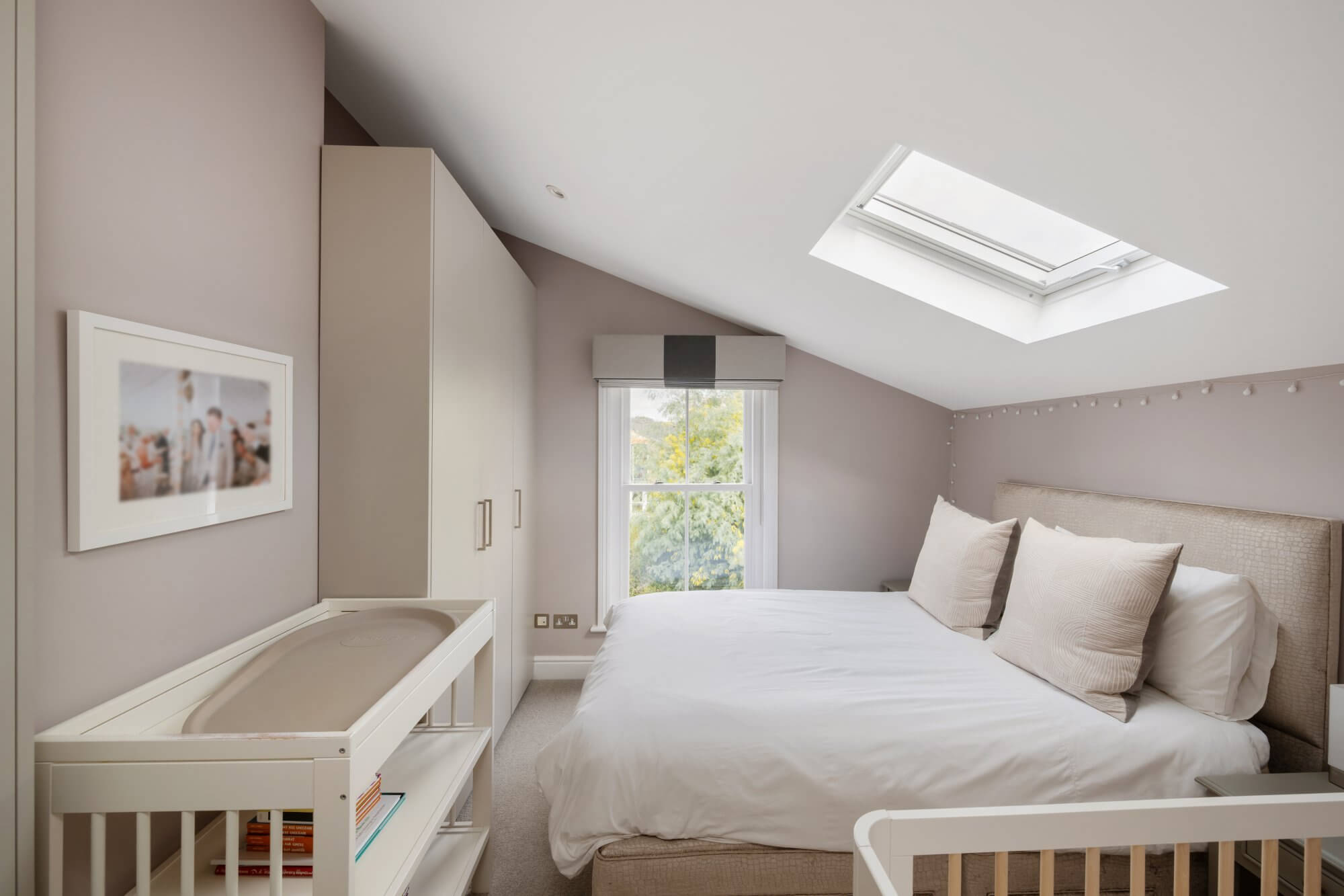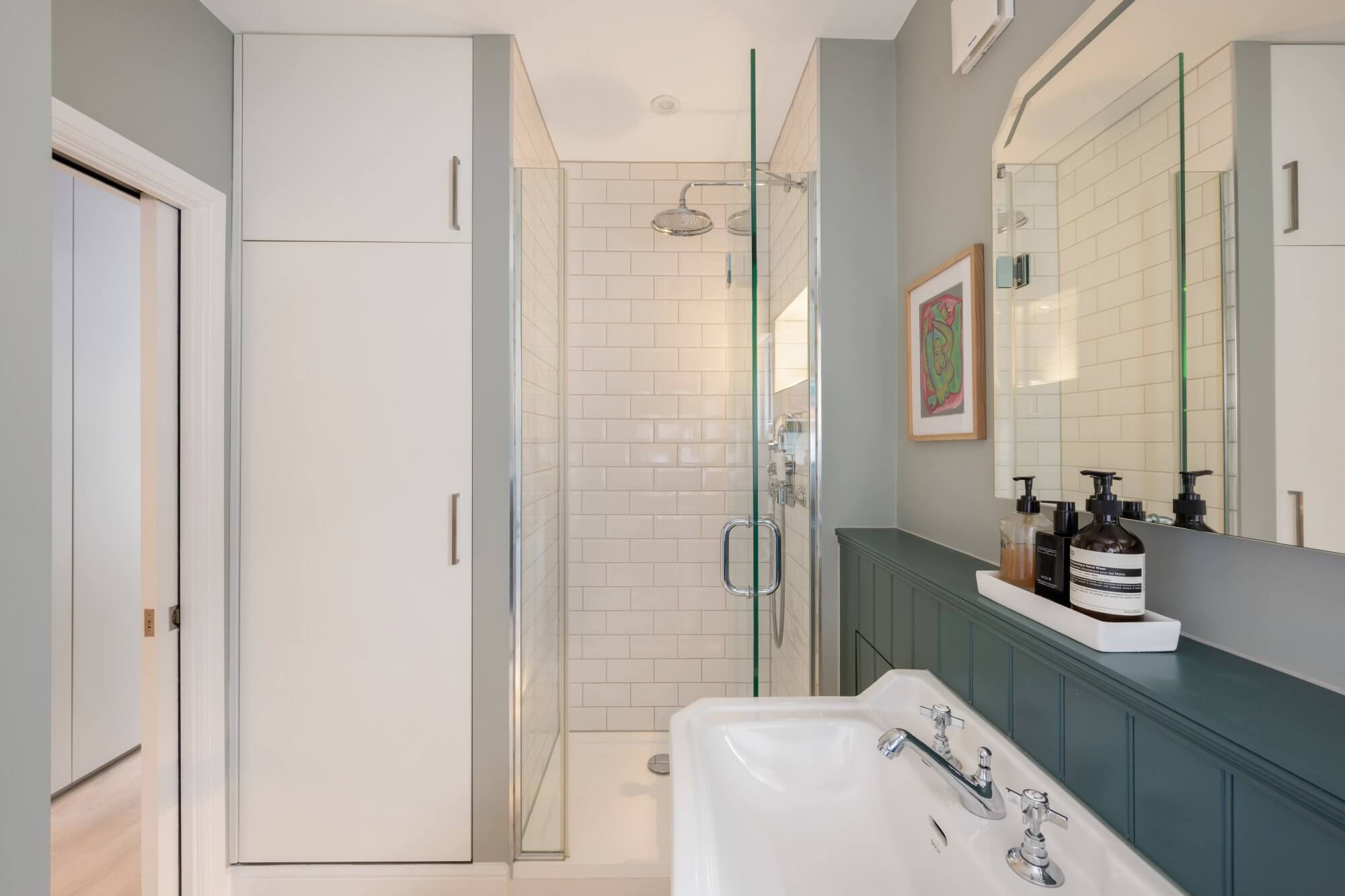 There are three generous double bedrooms in total. Two are arranged on the lower level, both with ample built in wardrobe space, one served by a stylish en suite shower room. An additional shower room also functions as a utility space, housing the washing and drying machines. The loft level is dedicated to a particularly spacious main bedroom, complete with extensive built in wardrobes and a luxurious en suite bathroom with double sinks, separate shower and roll top bath. All bathrooms are recently fitted and finished in a cohesive, understated style.