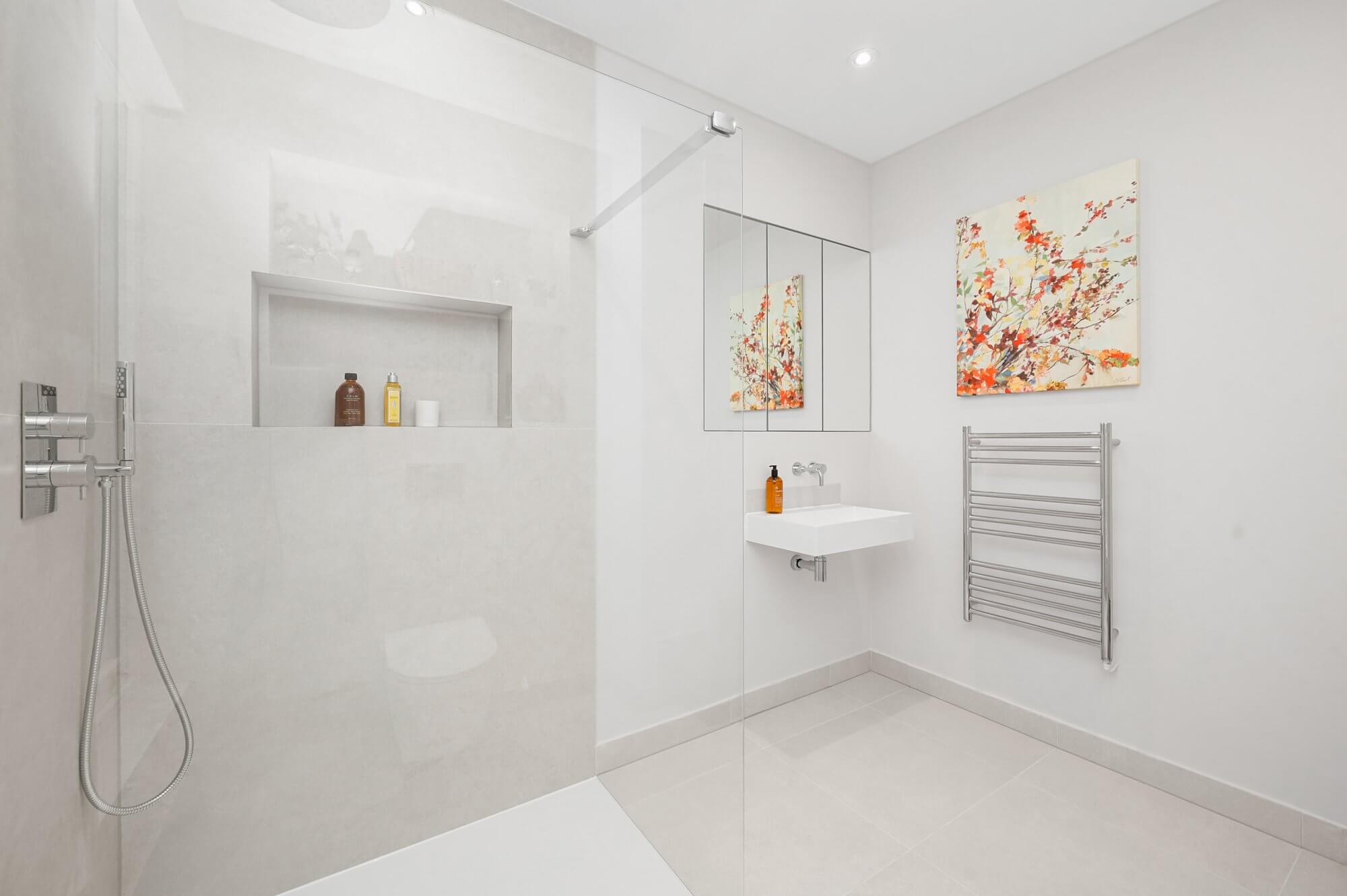 The large bedroom suite is calm and inviting, with excellent wardrobe space and a smart, stylishly finished bathroom completing the accommodation.