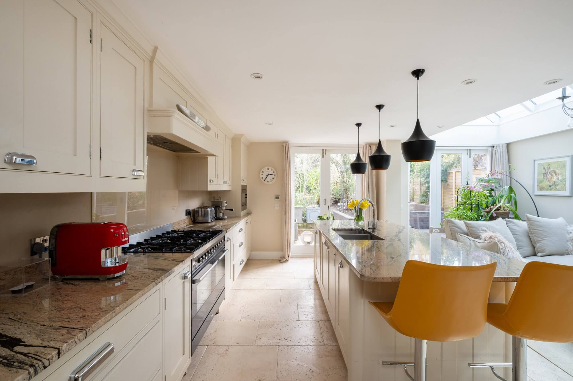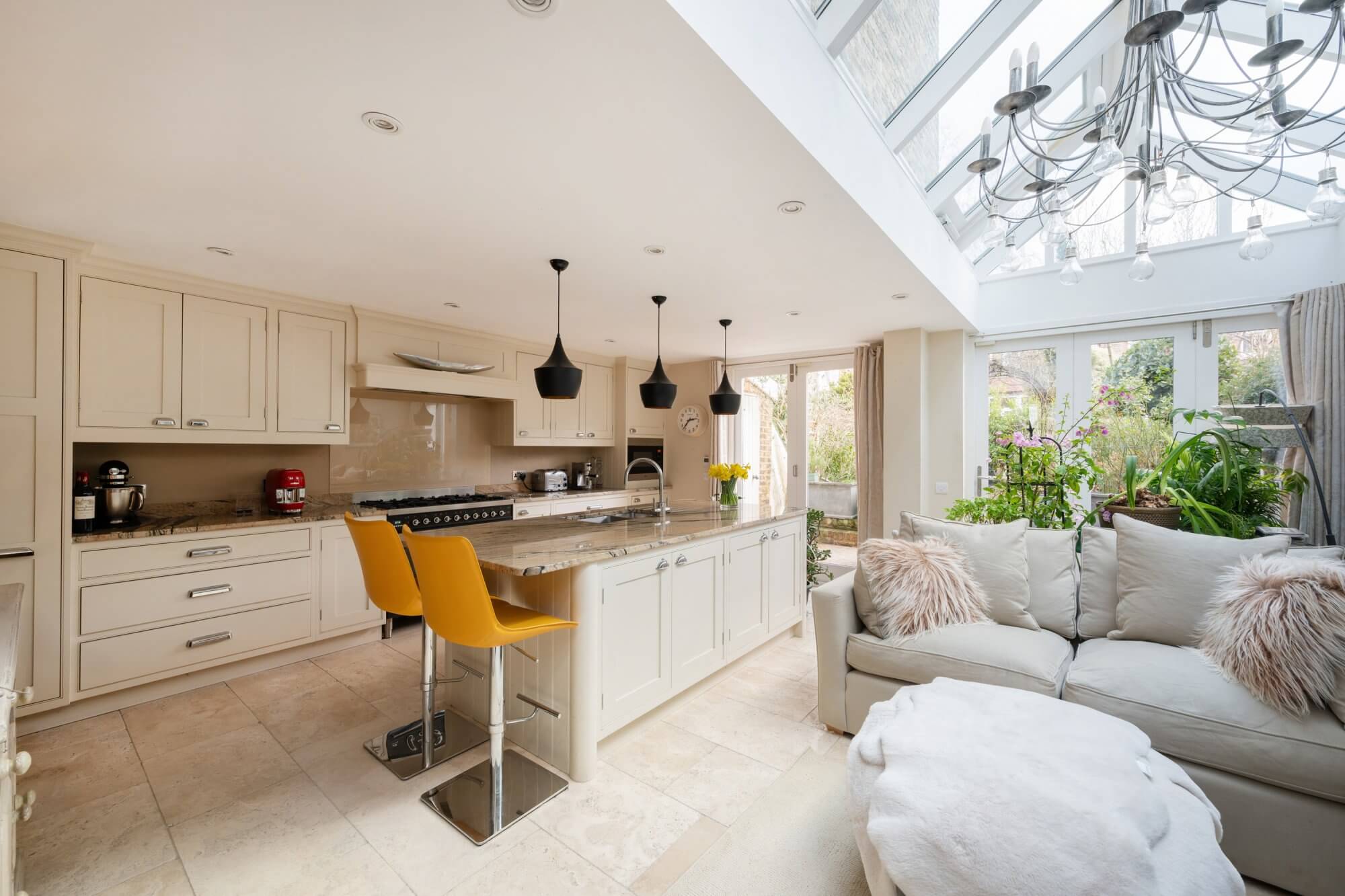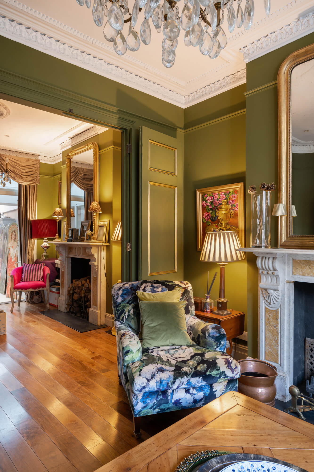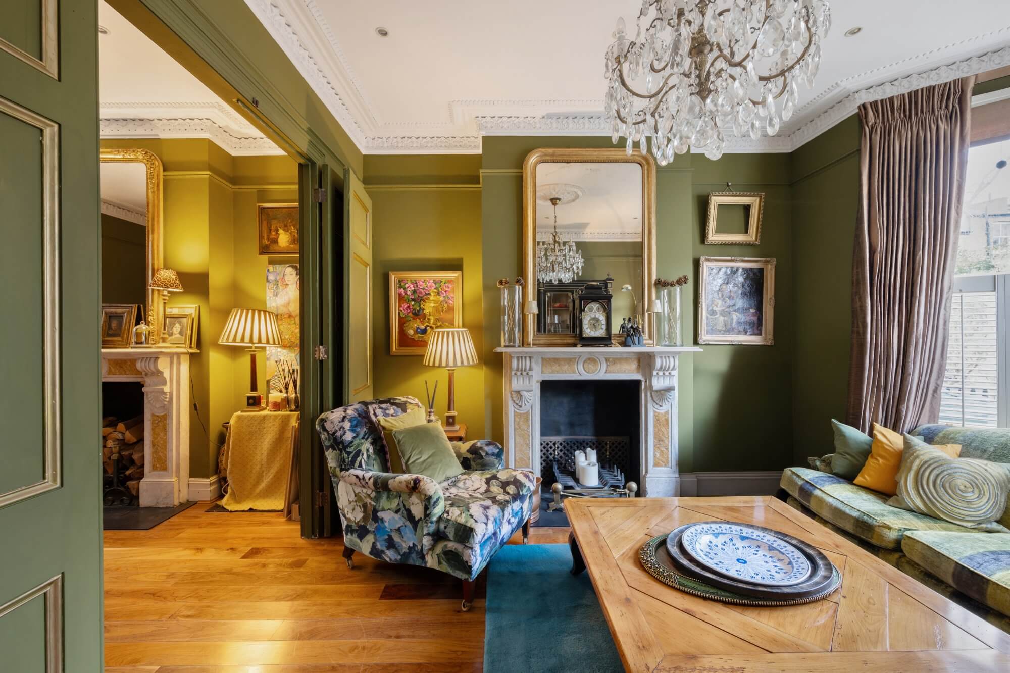 Arranged over four floors, this elegant house has been skillfully remodelled to balance period character with contemporary family living. The ground floor opens with a generous bay-fronted double reception room with dividing doors and matching pair of period fireplaces. This in turn leads through to the full width kitchen/breakfast room with bespoke fitted units, premium quality appliances, a statement central island and glazed doors opening directly onto the garden, creating a wonderful sense of light and connection to the outdoors. A guest cloakroom/utility completes this level, while a substantial cellar provides useful storage.