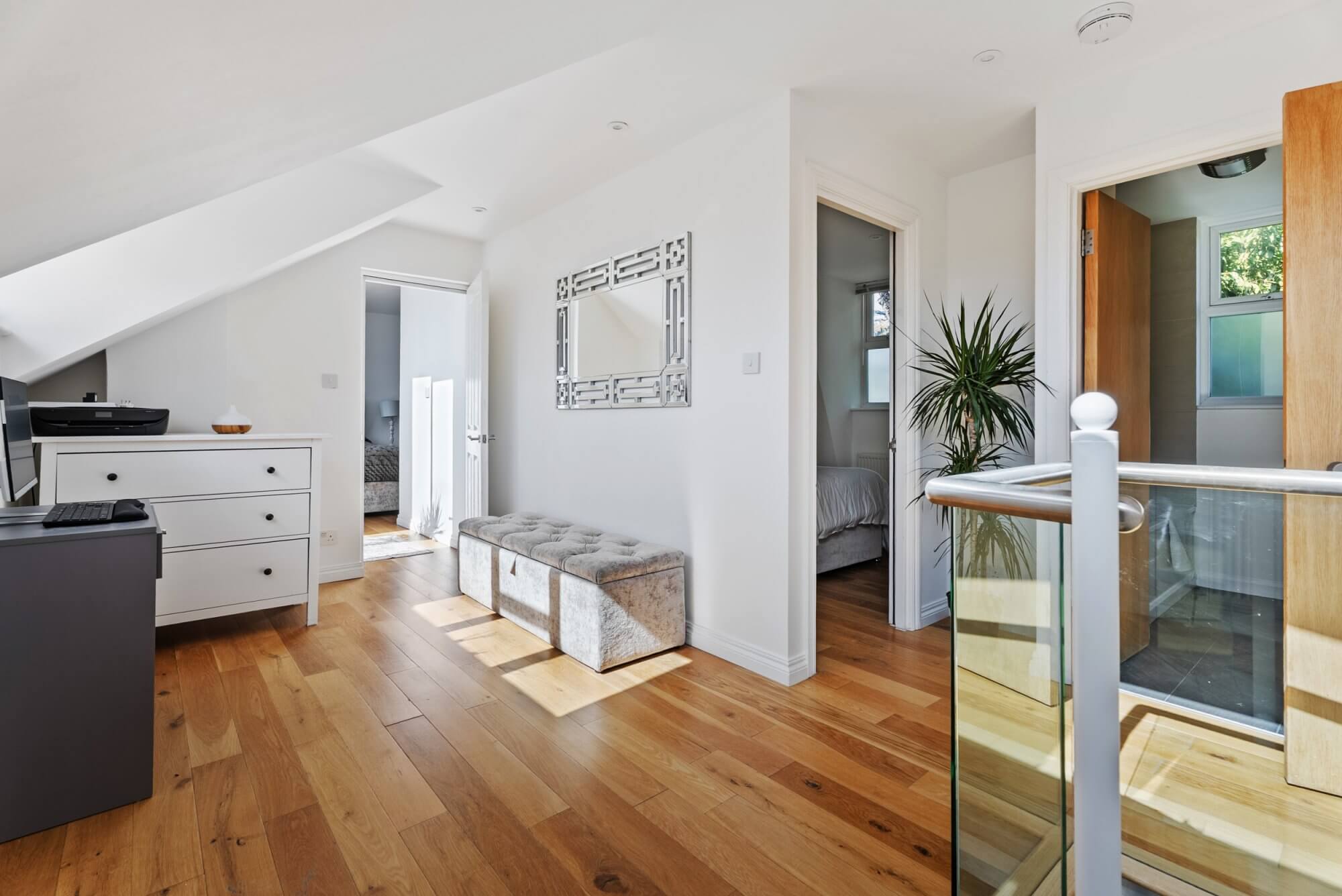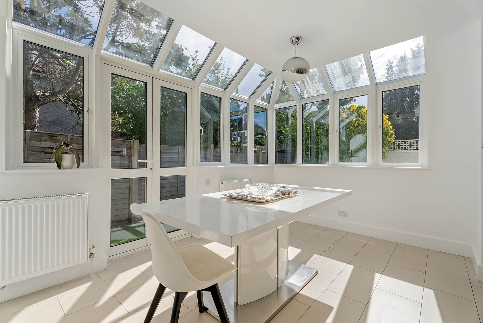 At the front of the home lies an impressive 18-meter south-facing garden, allowing sunlight to flood the interiors through expansive aluminium-framed windows on both floors, a charming conservatory, and a first-floor balcony—perfect for enjoying morning coffee or evening sunsets.