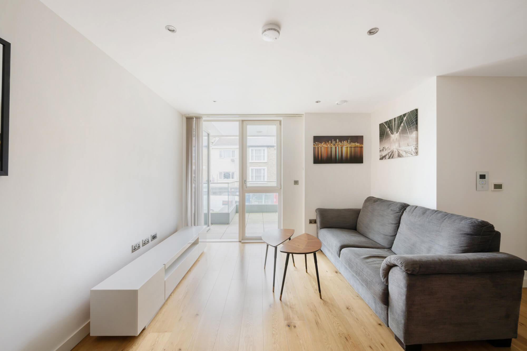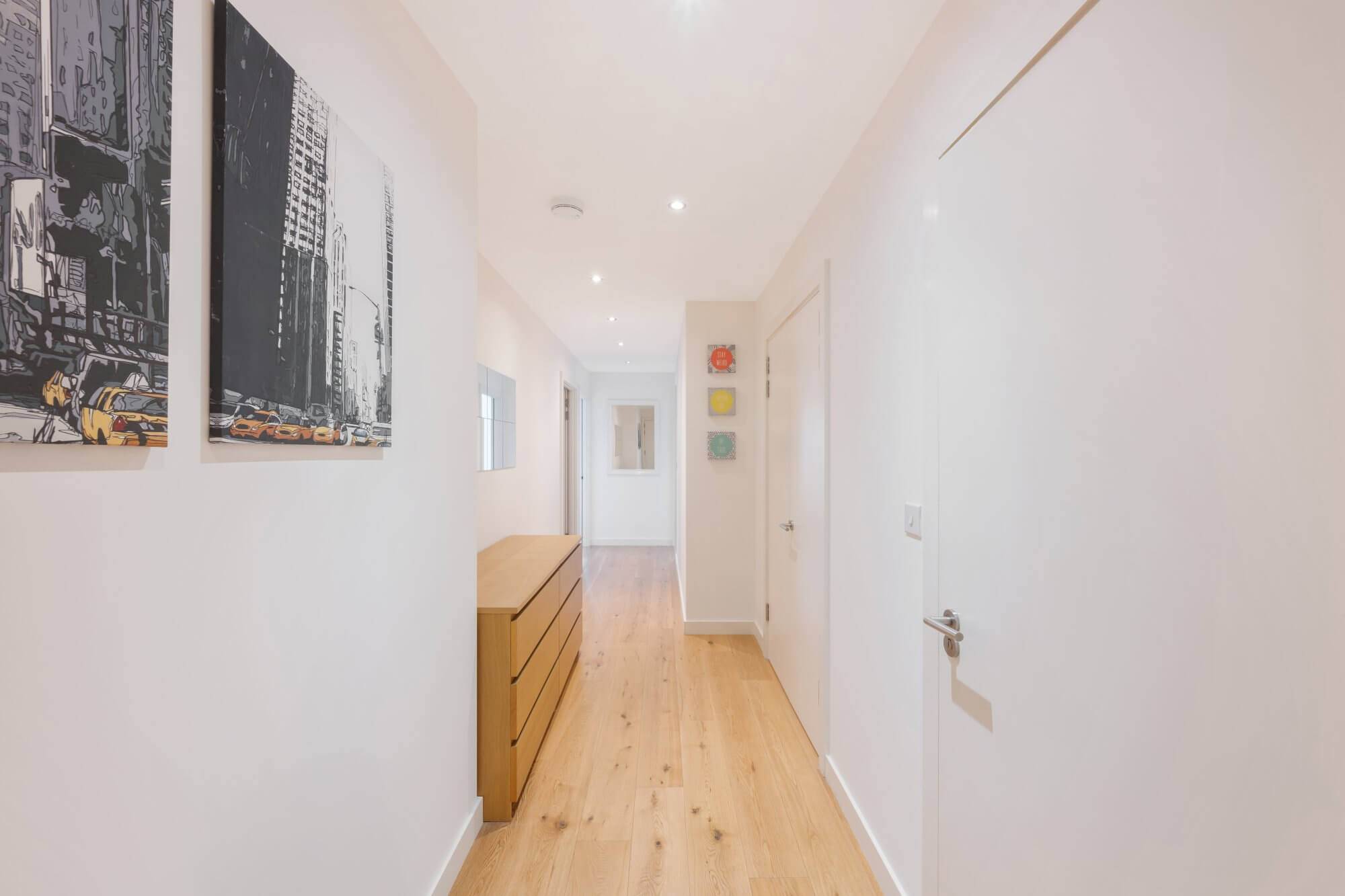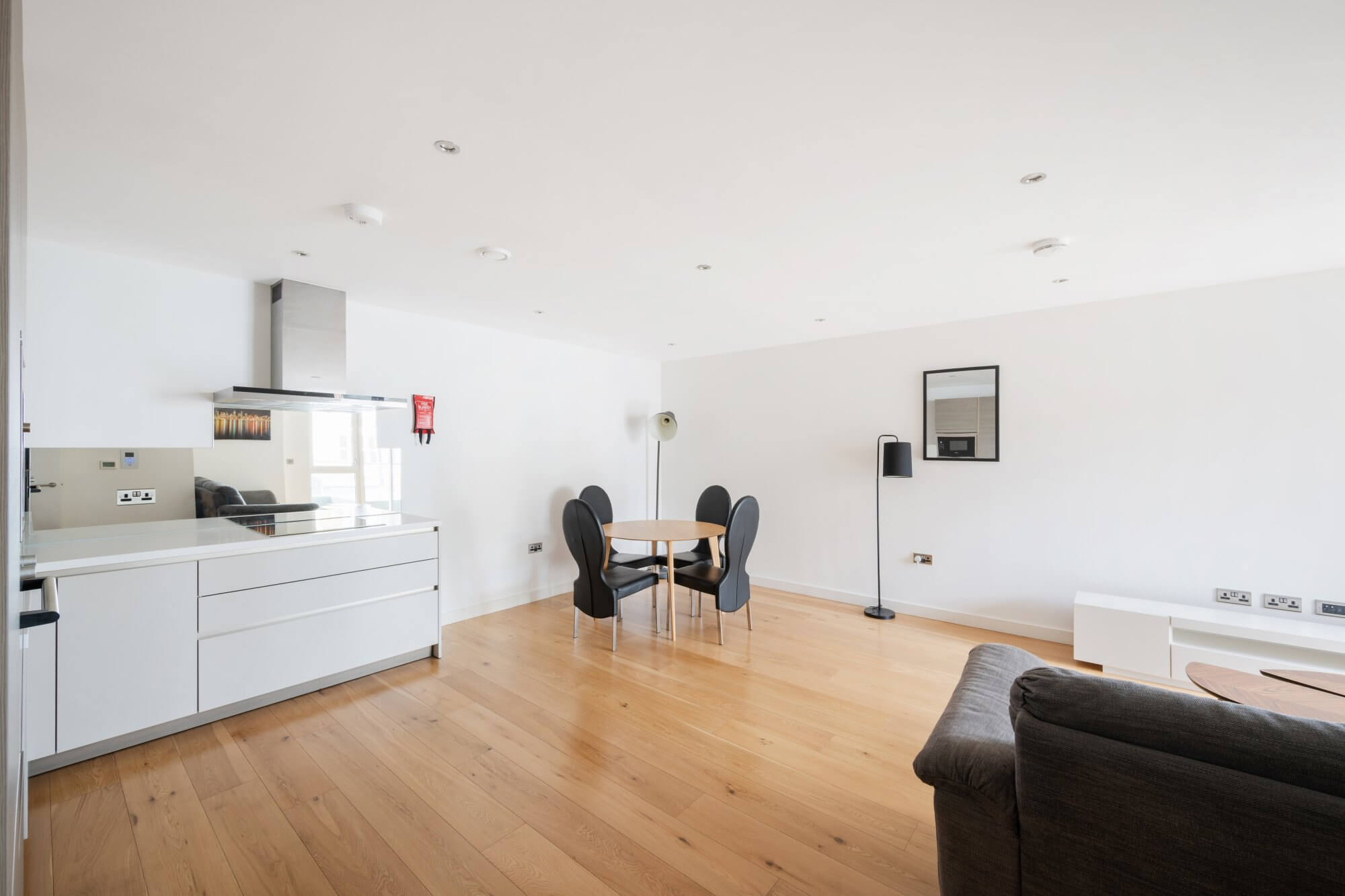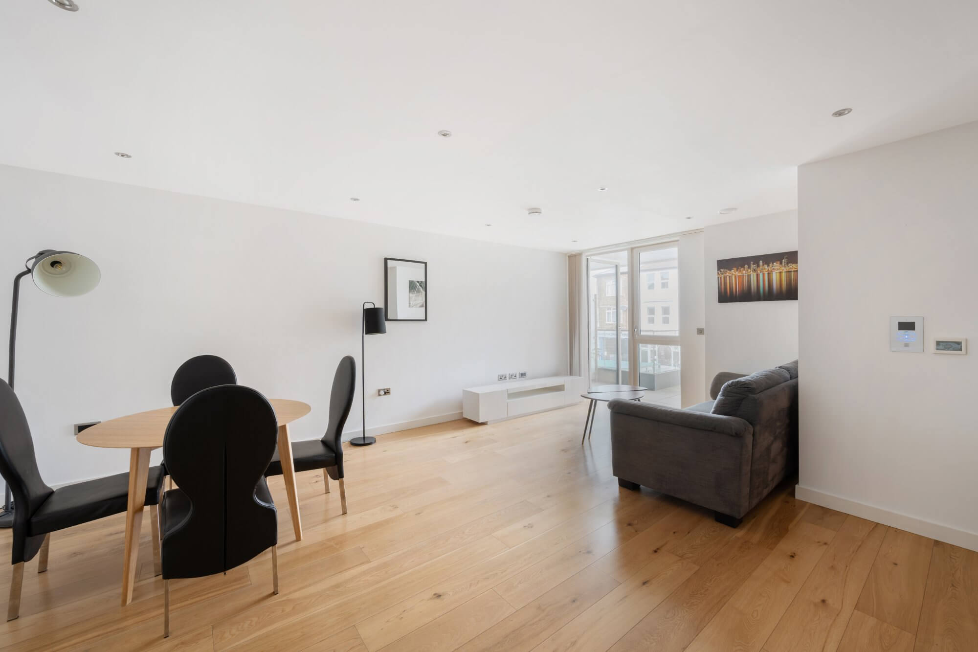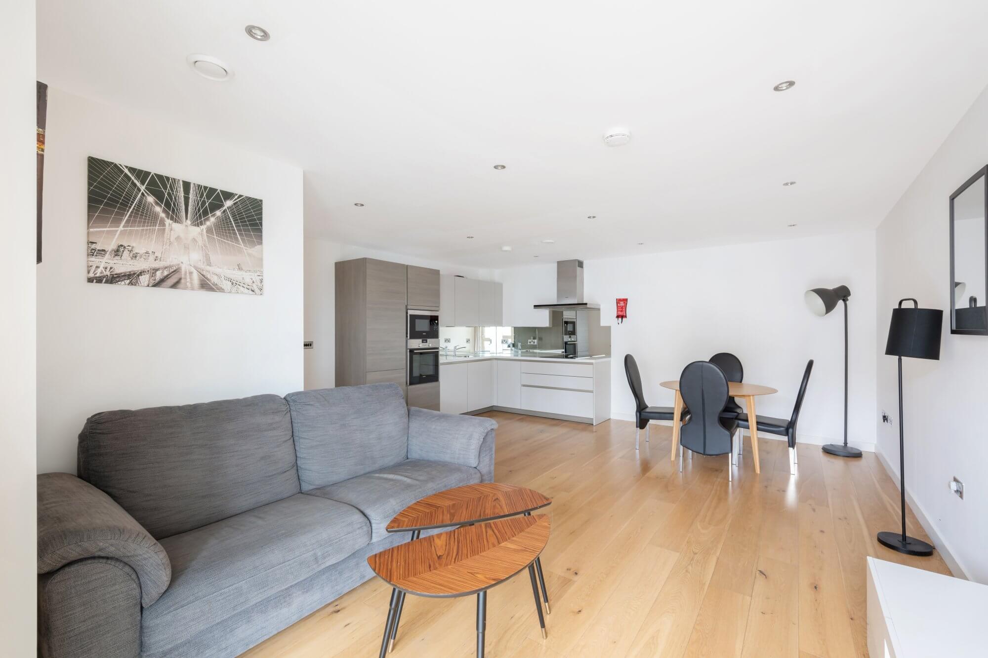 The heart of the apartment is a generous open-plan reception, dining and kitchen space, designed to maximise light and flow. Wooden flooring runs throughout, creating a sense of continuity and warmth, while large doors open directly onto a private balcony, extending the living space and providing an ideal setting for morning coffee or relaxed evening entertaining. The fully integrated kitchen is finished in a clean, contemporary style, with sleek cabinetry and quality appliances, offering both functionality and understated elegance.