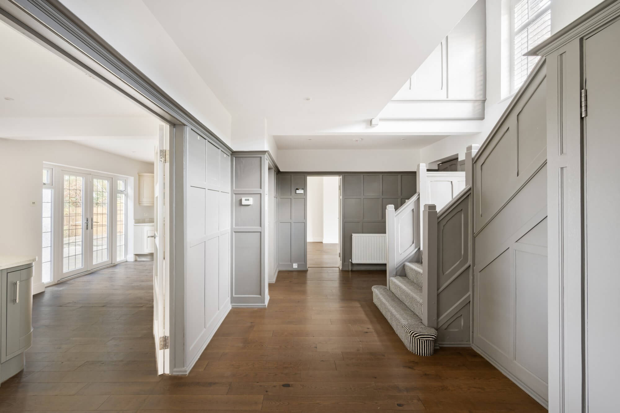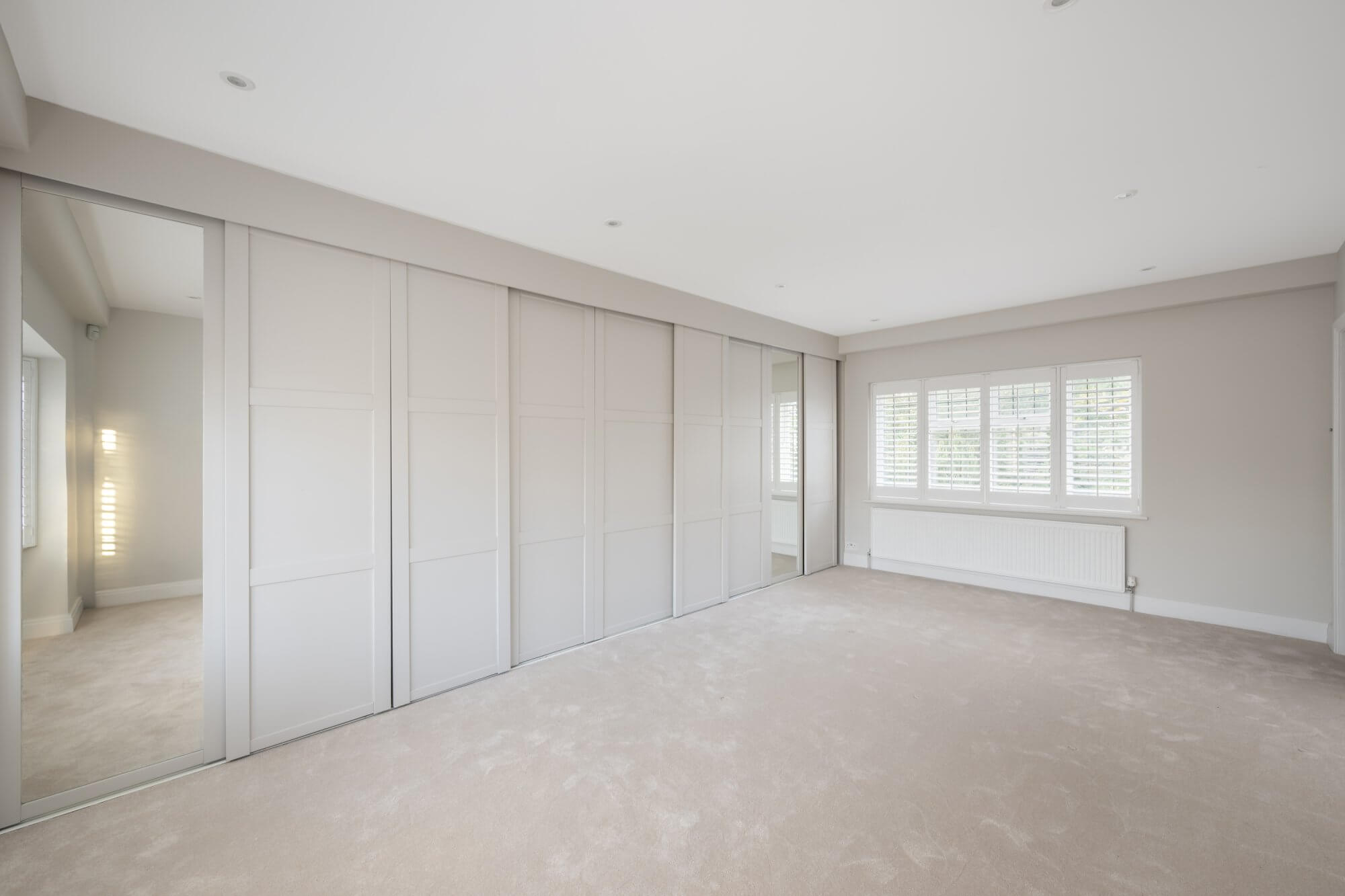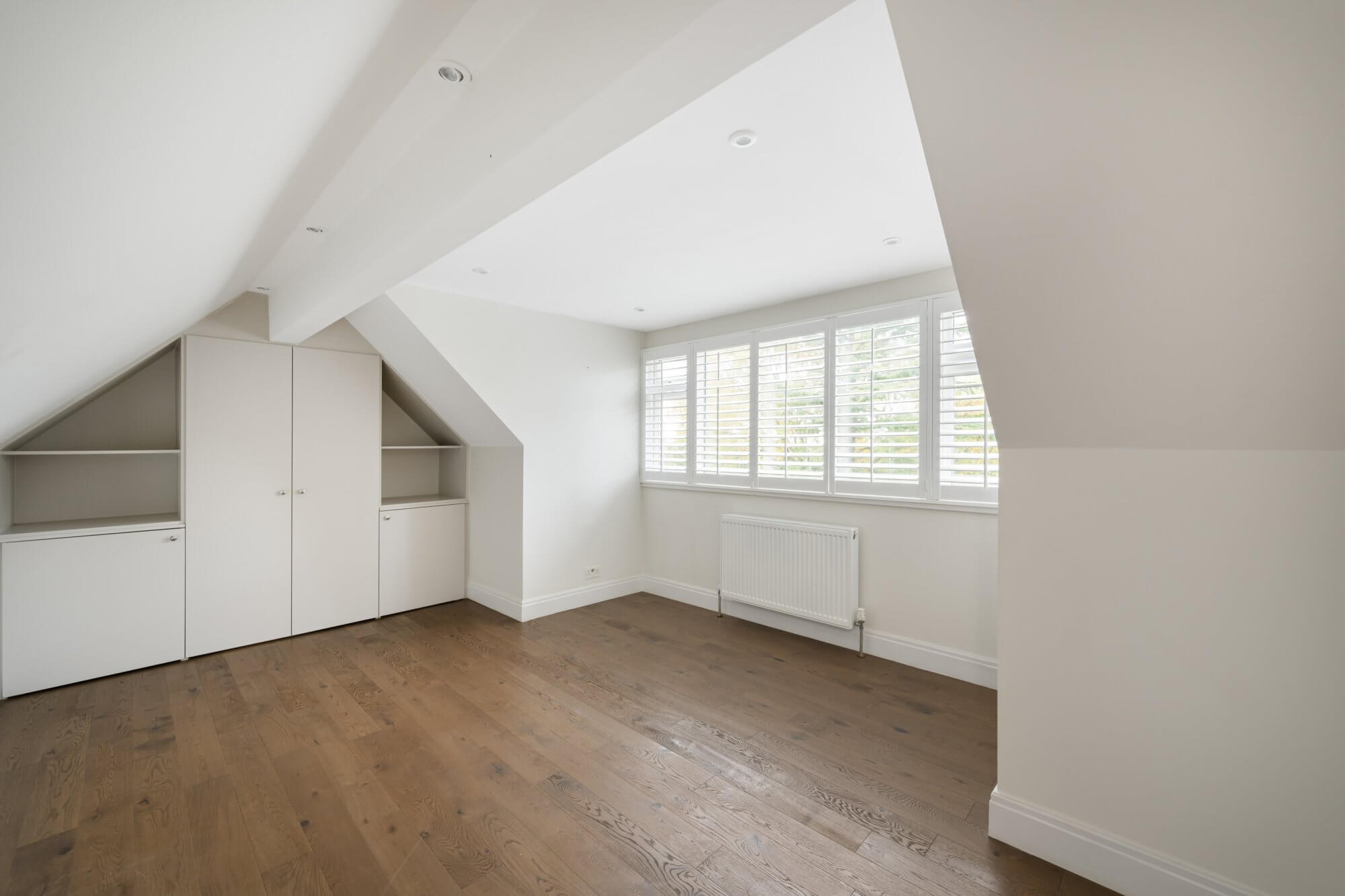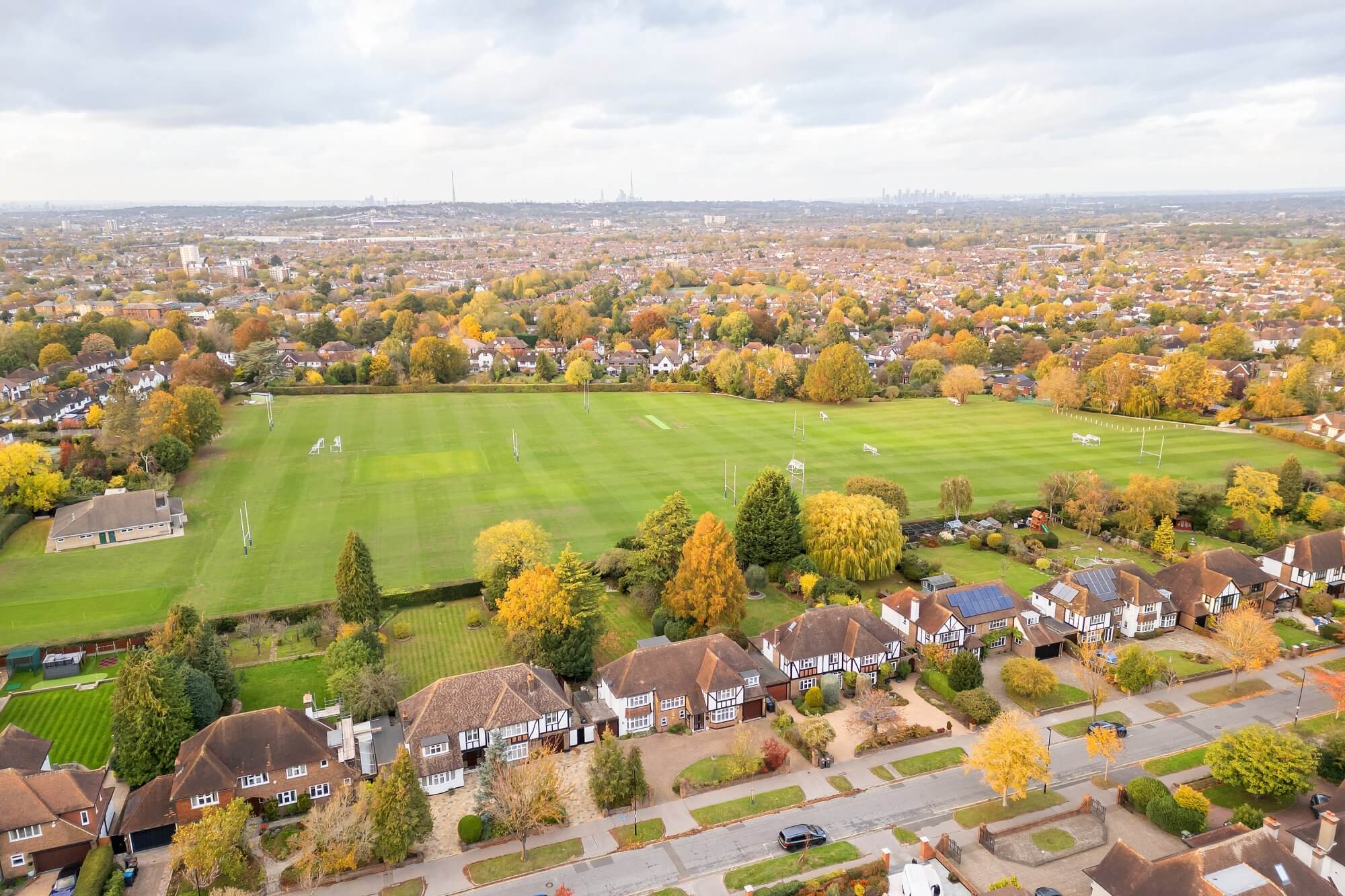 A substantial double fronted, five double bedroom family residence which measures 3,370 square feet, and yet has huge potential to be further extended as required, given its 130′ x 70′ level rear garden. Enjoying far reaching views towards the City it backs directly on to playing fields and therefore enjoys a magnificent ‘borrowed landscape’.