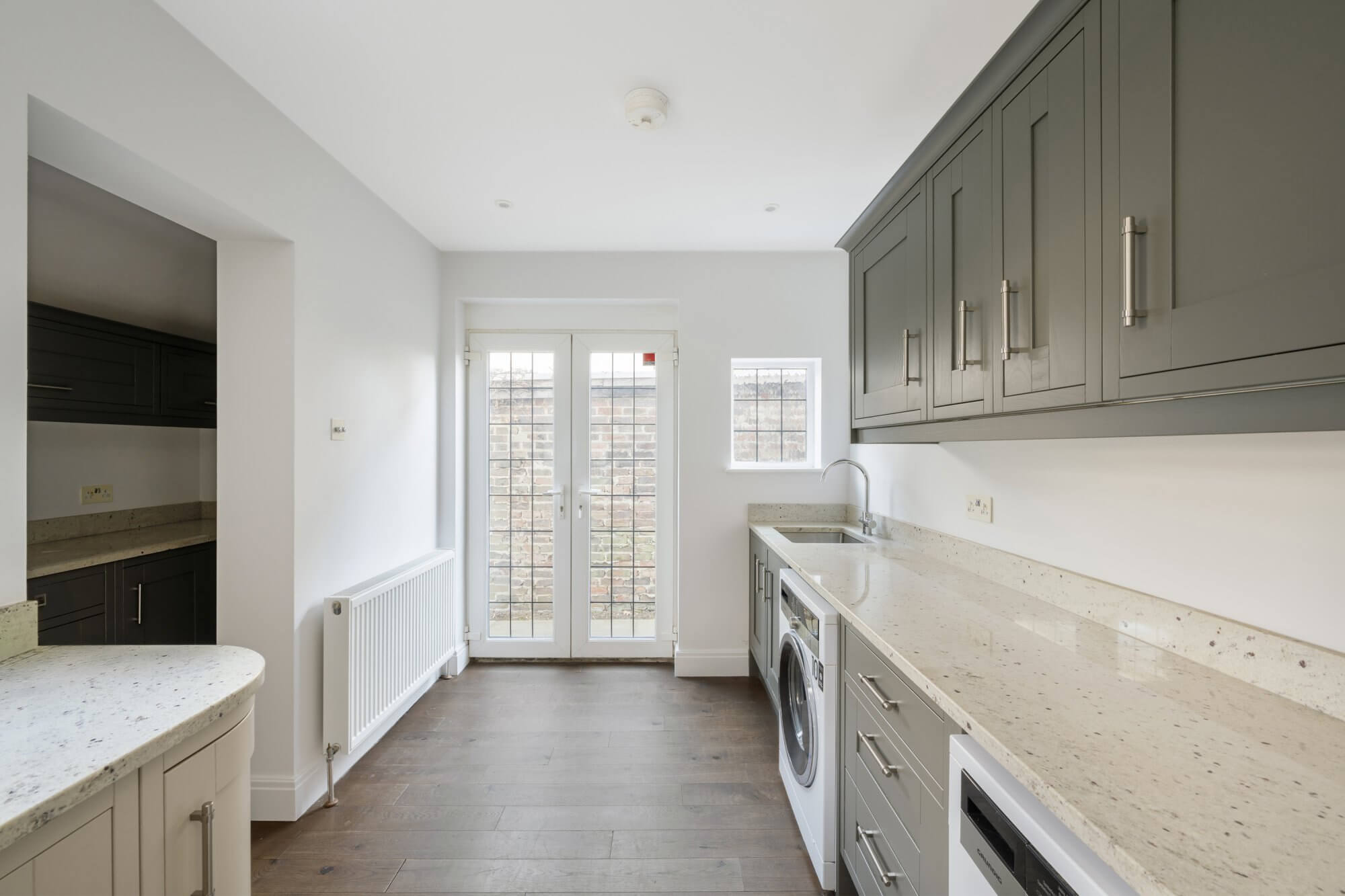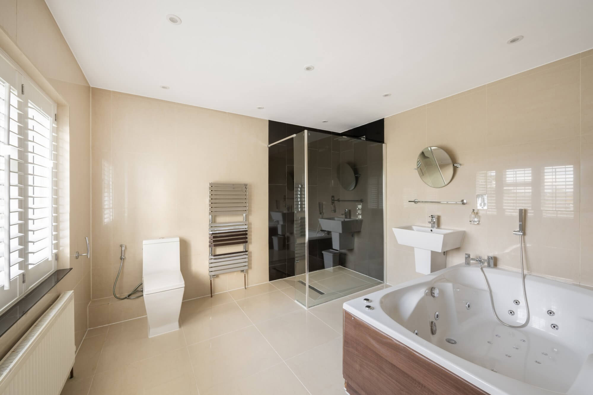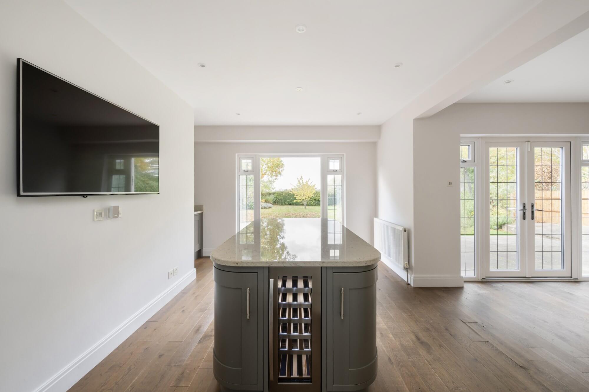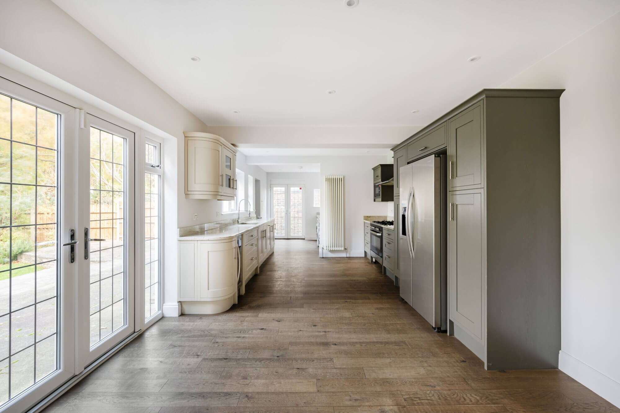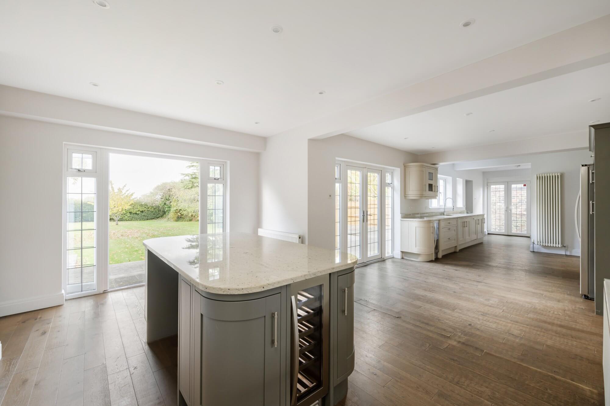 The property has been extensively updated and modernised in the recent past by the current owners, while offering extension potential to both rear and loft, subject to planning permission. Currently the accommodation briefly comprises; entrance porch, large panelled hallway, guest cloakroom/W.C., triple aspect reception room, further large reception, incredible 41′ x 15′ kitchen dining room, pantry/utility room, garden store, two garages and off street parking for numerous cars. The kitchen is a top of the range fitted kitchen and the luxurious bathrooms are all of a consistent high standard.