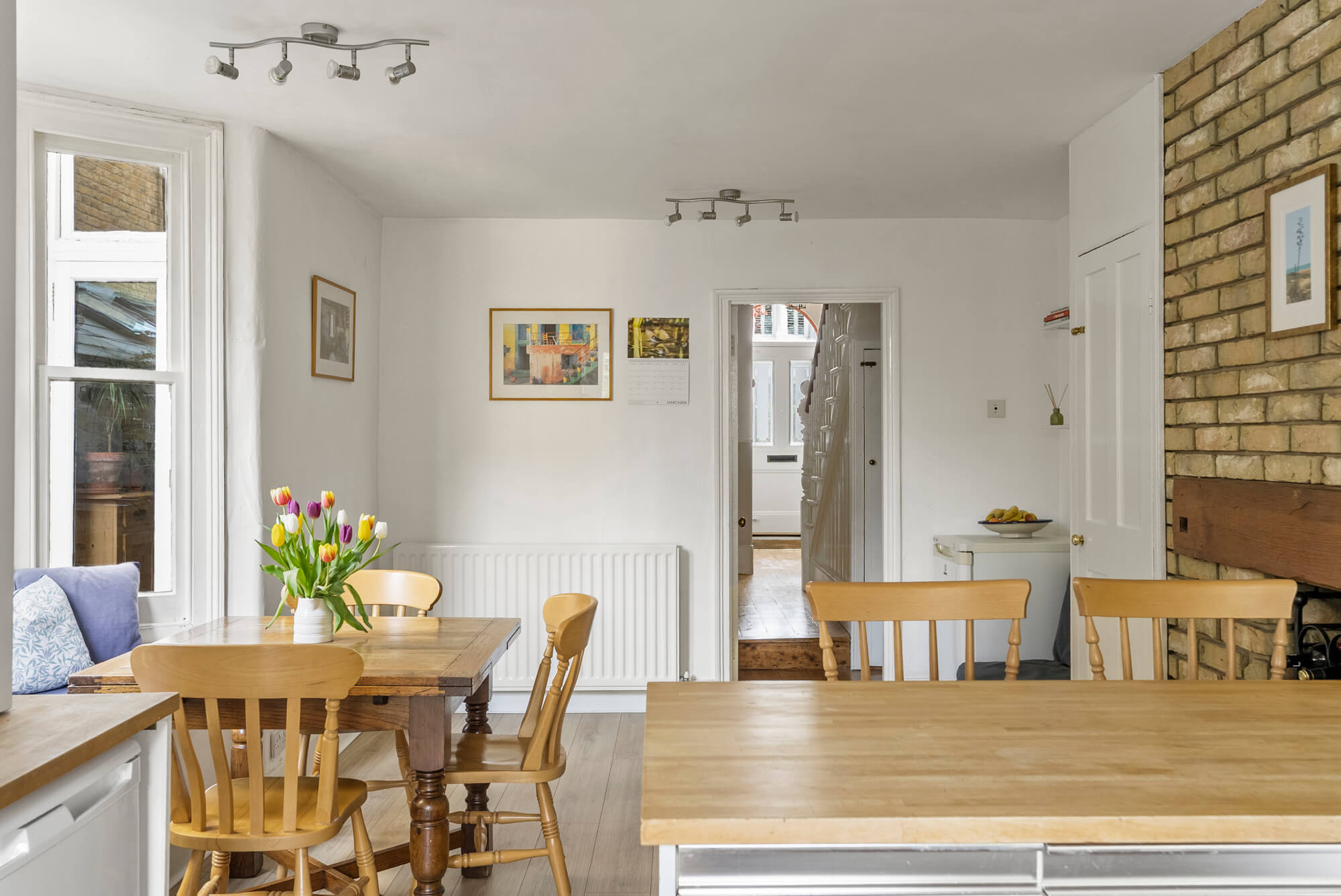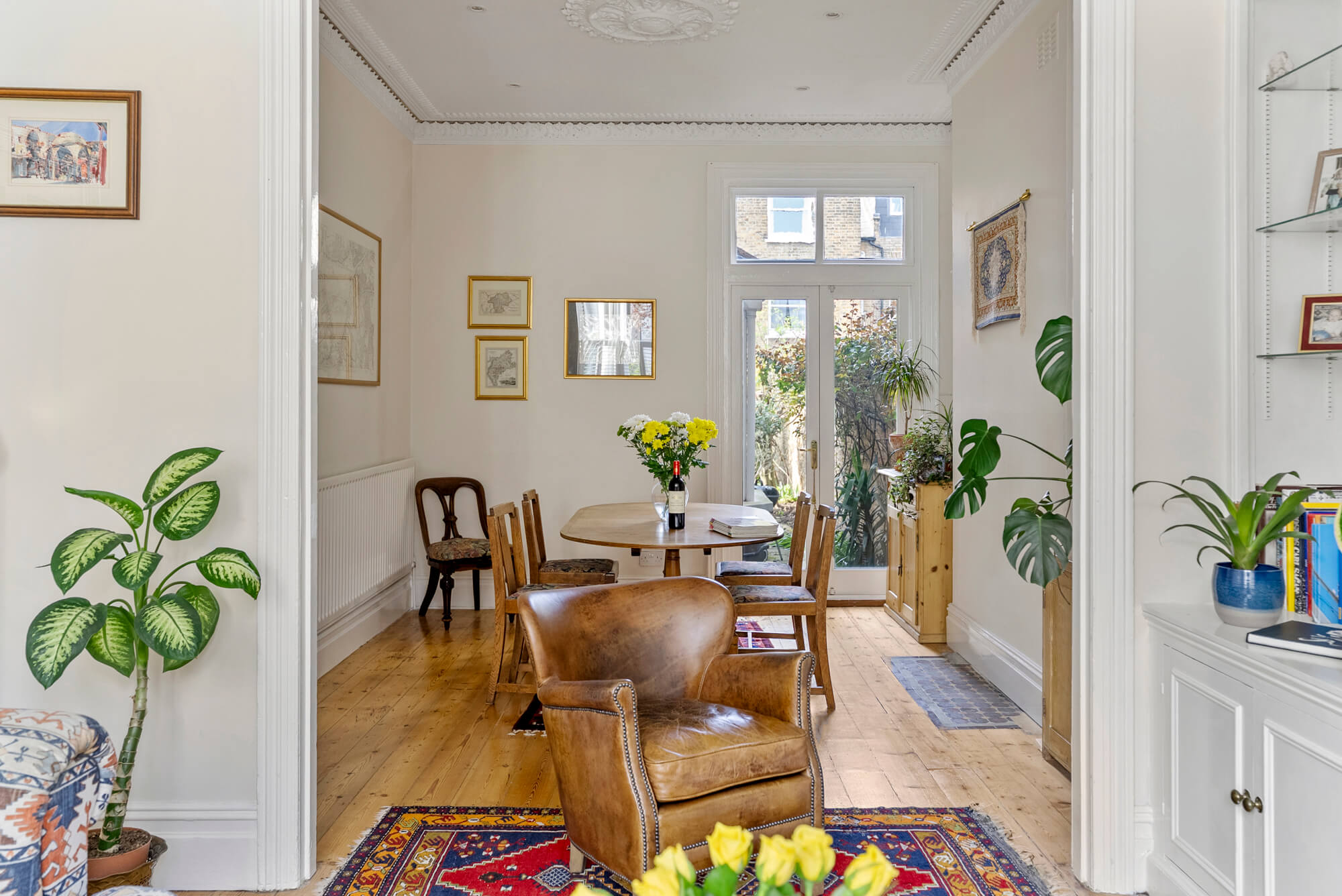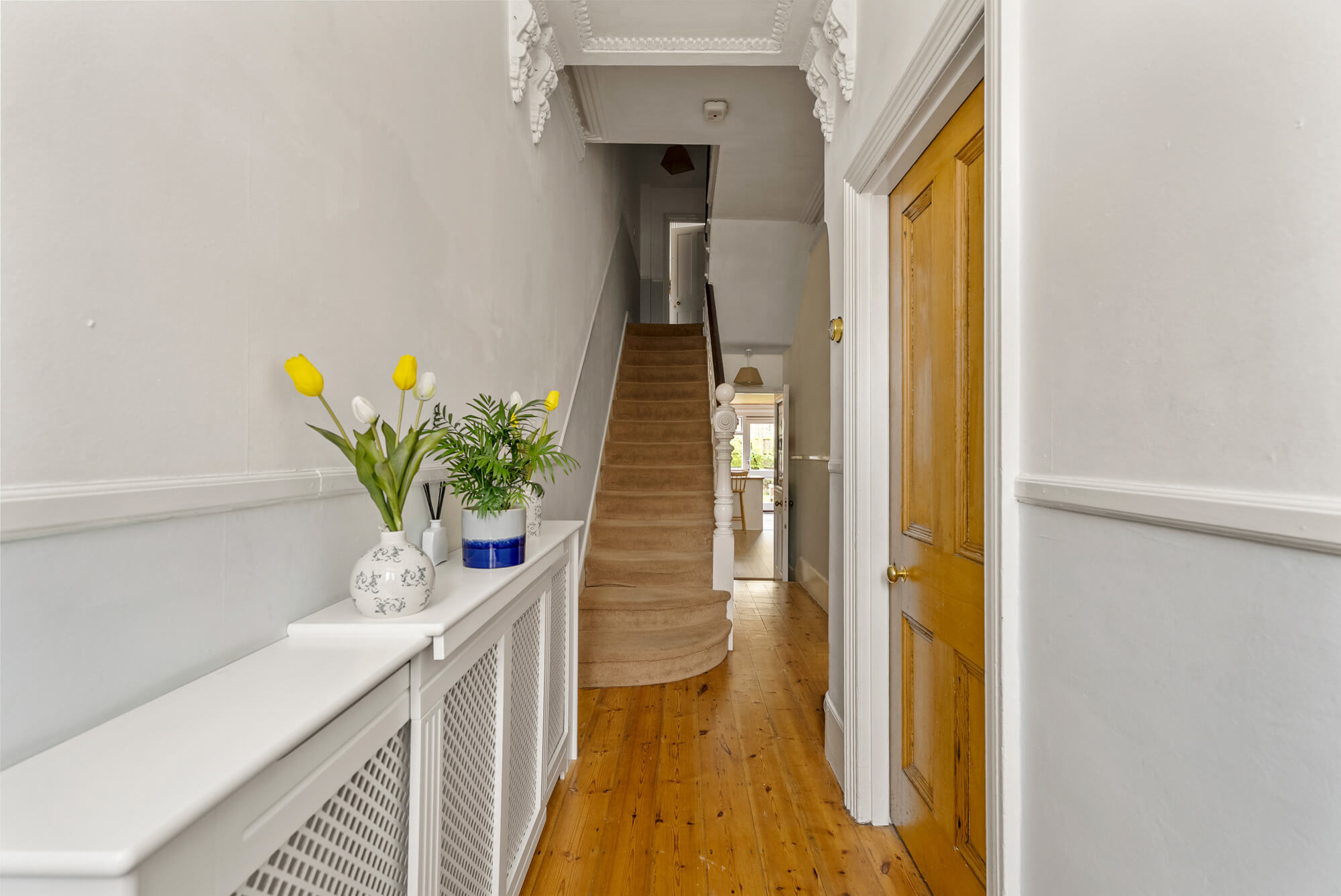 Arranged over four floors, the light and spacious accommodation offers excellent entertaining space with a wide double reception room, with attractive splay bay window to the front. The room has exposed wooden floors and the most exquisite ornate cornicing to the ceiling.