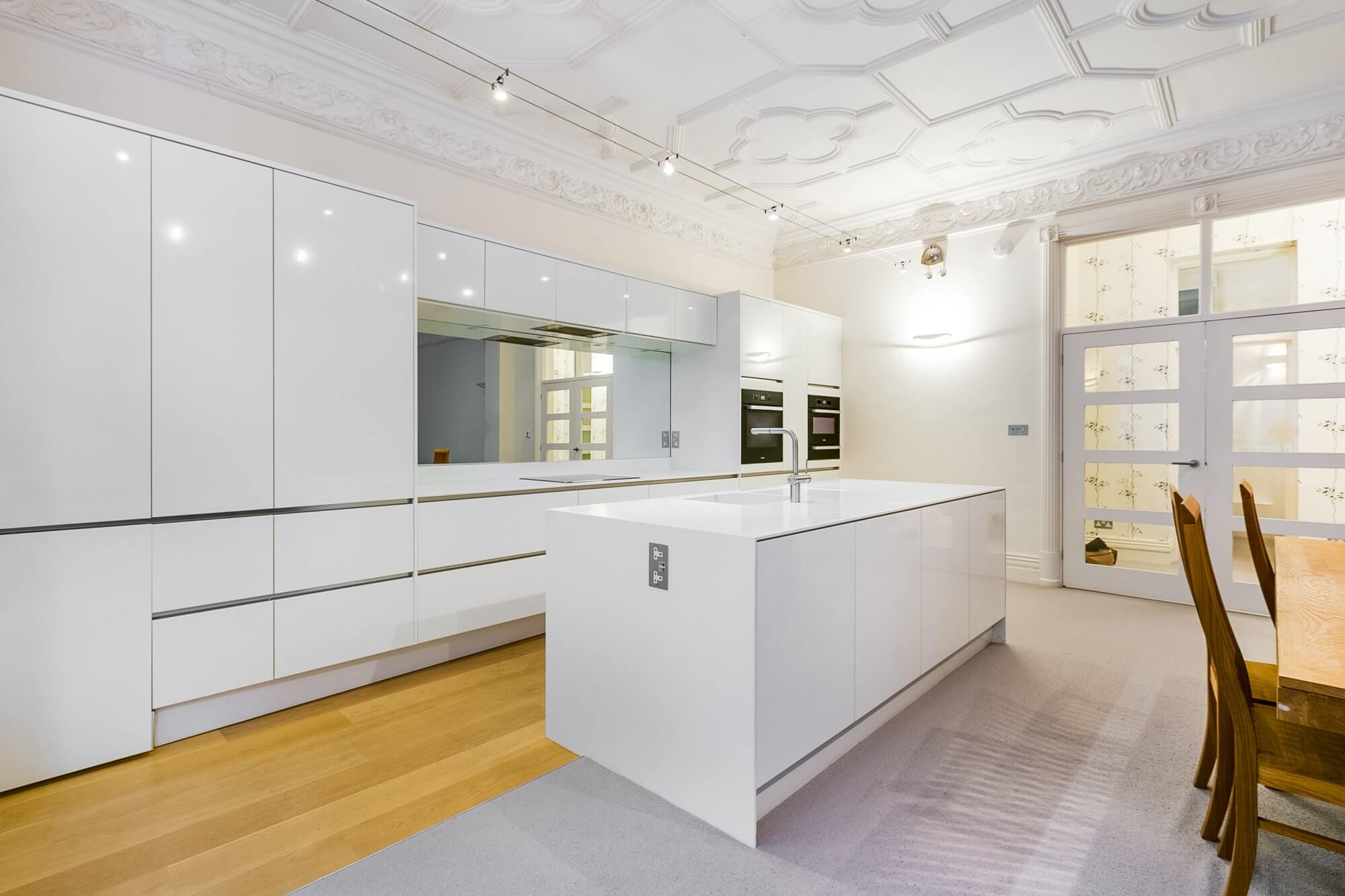 The focal point of the residence is its spacious open-plan living, dining, and kitchen area, where traditional features harmonise with modern elements. Admire the ornate plastered ceiling and cornices, while enjoying the comfort of a sleek kitchen equipped with a center island and top-of-the-line appliances, illuminated by wall-mount and tension wire spot lights. Boasting high ceilings and ample natural light pouring in from the expansive bay windows, this room exudes a grand ambiance.