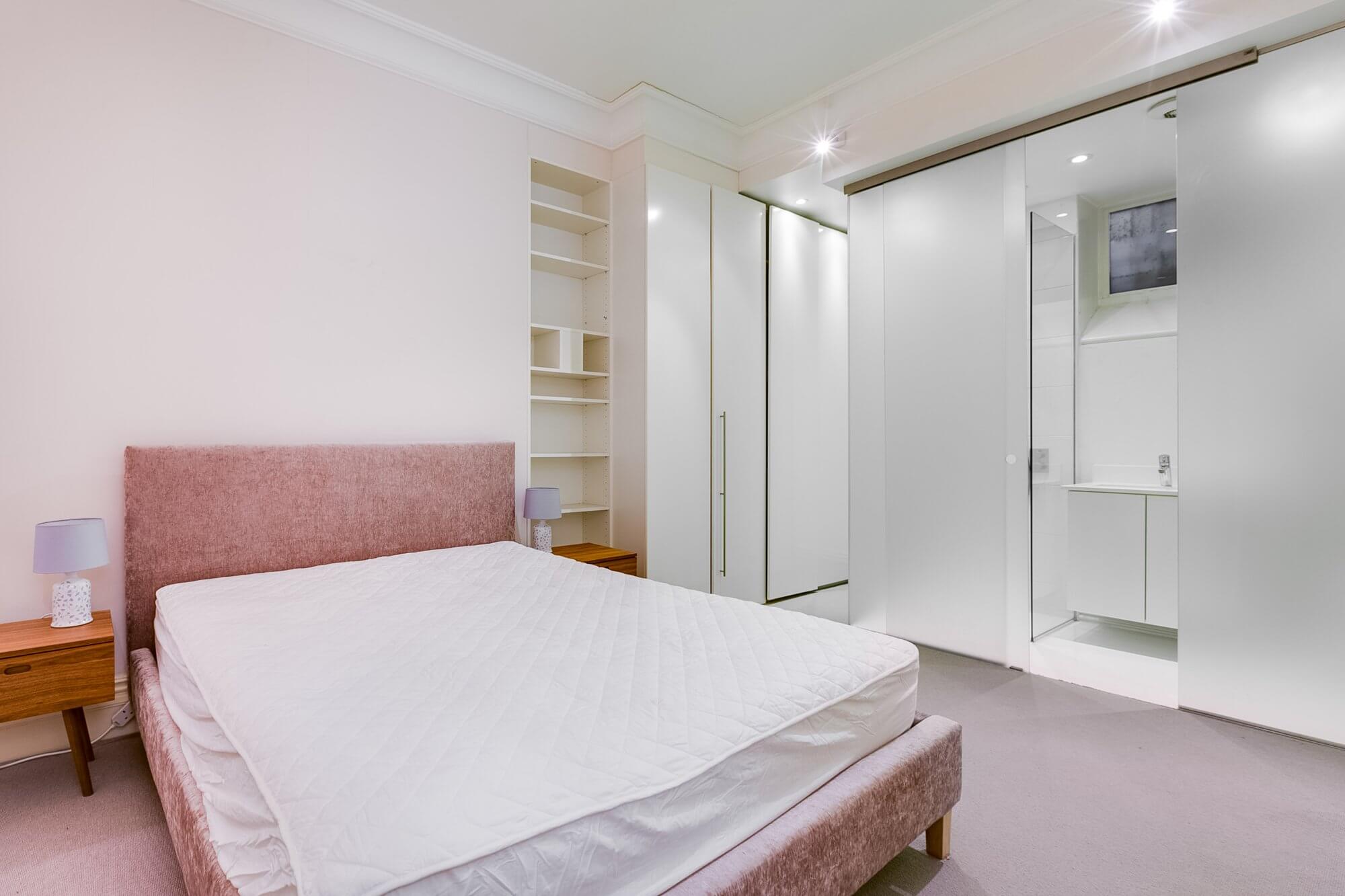 The master bedroom offers generous proportions, featuring built-in shelves and wardrobes for ample storage, along with a stylish en suite bathroom for relaxation. A second double bedroom, and a sophisticated family bathroom, offer comfortable and elegant living spaces, adding to the allure of this distinguished property.