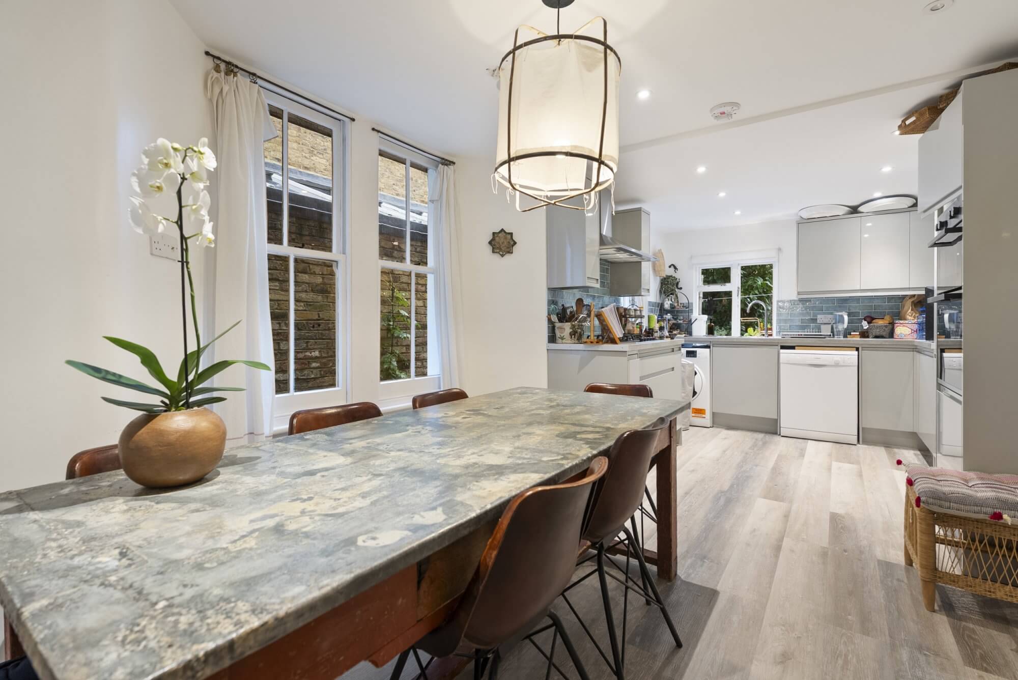 The modern fully fitted kitchen offers extensive dining space for up to eight and opens onto a charming private rear garden. The first floor comprises two generous double bedrooms, a guest W.C., and a contemporary en-suite shower room. A further well-proportioned bedroom and a stylish family bathroom are located on the second floor.