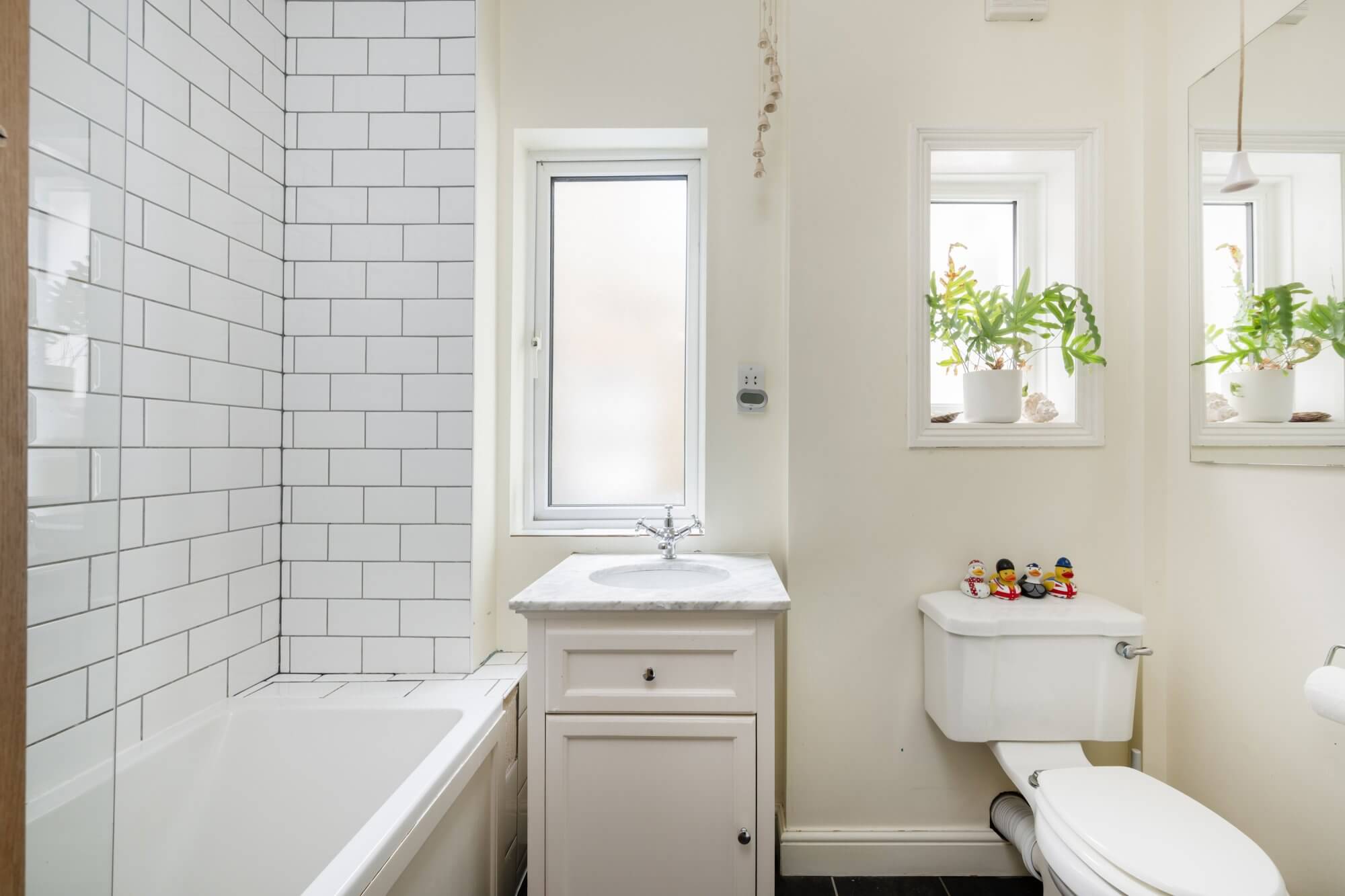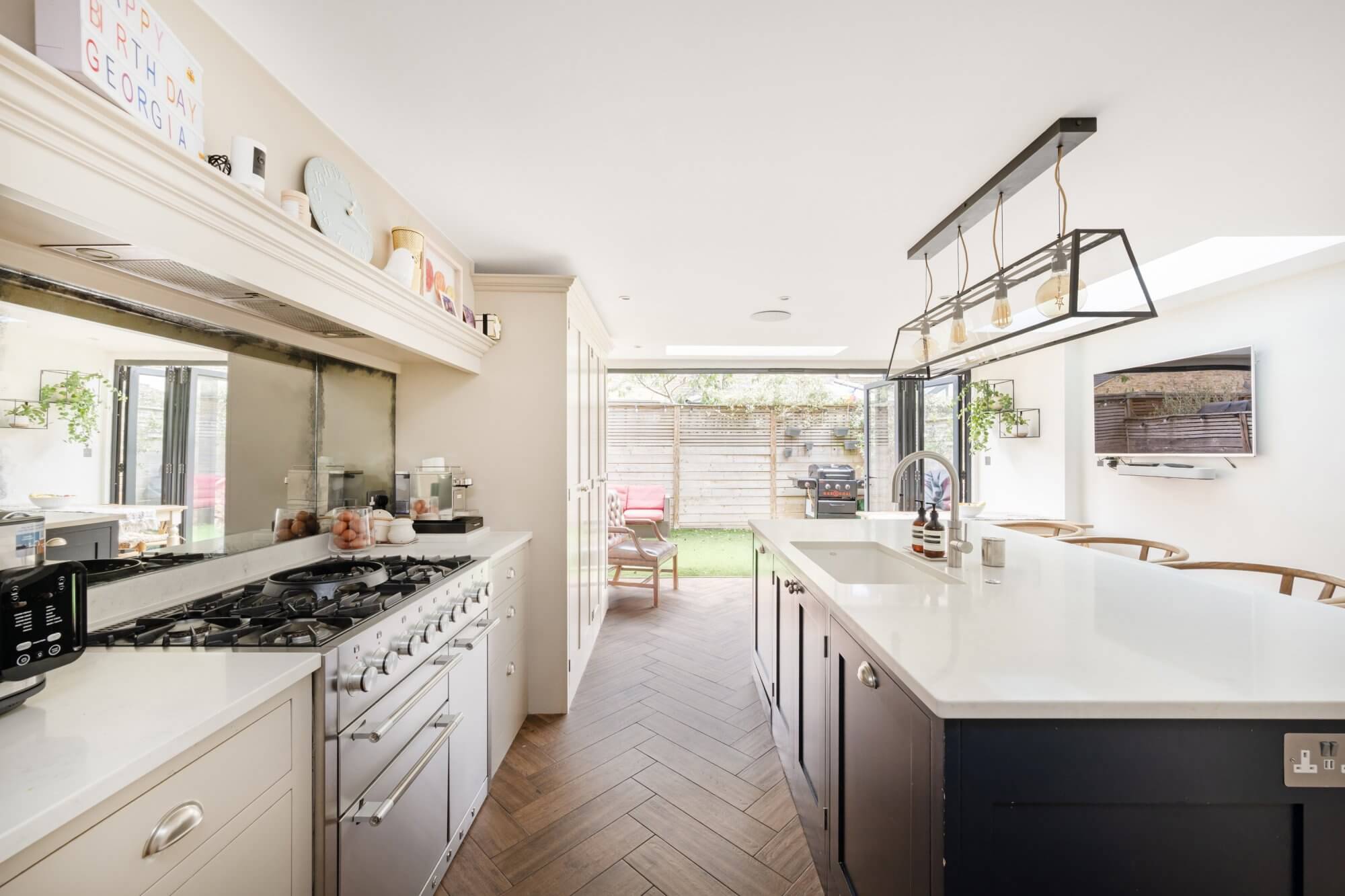 The ground floor boasts a spacious double reception room, perfect for entertaining or relaxing, leading into a stylish shaker-style kitchen/breakfast room. Thoughtfully designed, the kitchen features bifold doors that open onto a compact, private south-east facing garden, creating a wonderful indoor-outdoor flow.