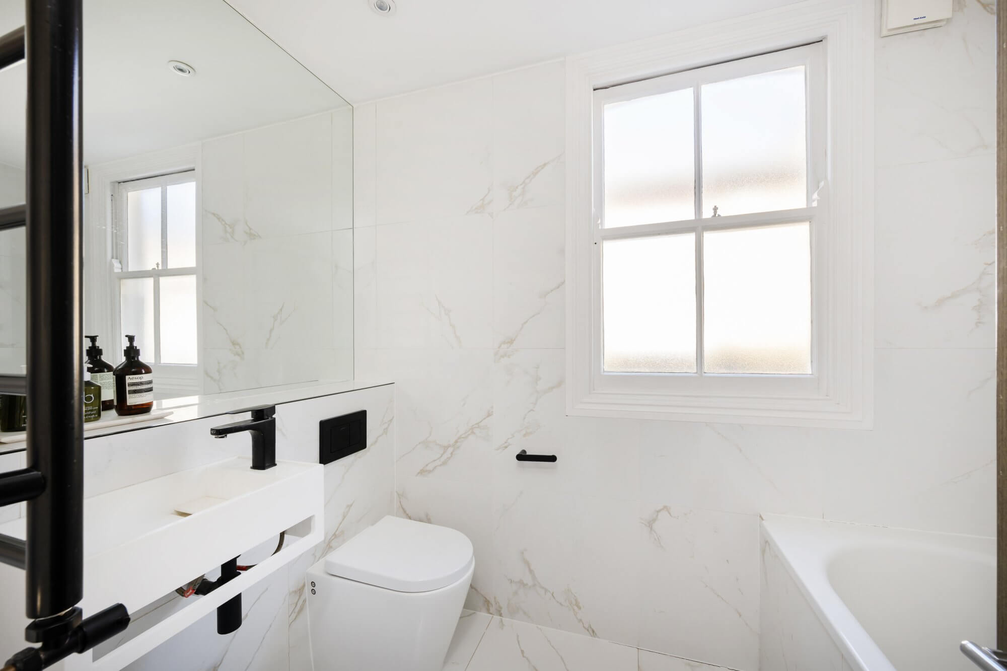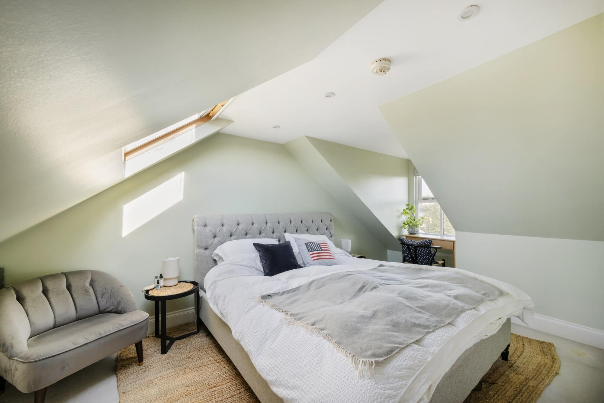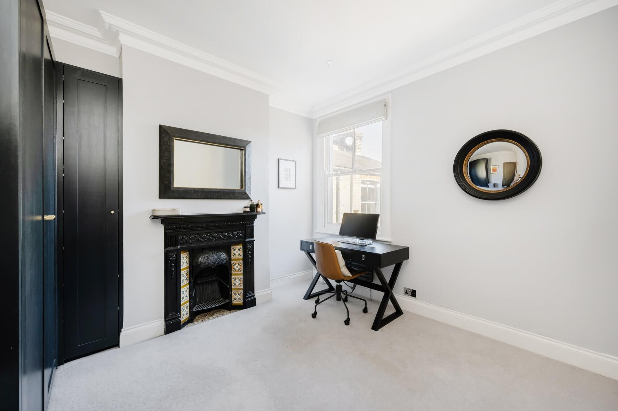 Upstairs, the principal bedroom occupies the top floor and benefits from generous eaves storage, while the second double bedroom is equally well-proportioned. The stylish modern bathroom includes sleek fittings and a clean, contemporary finish.