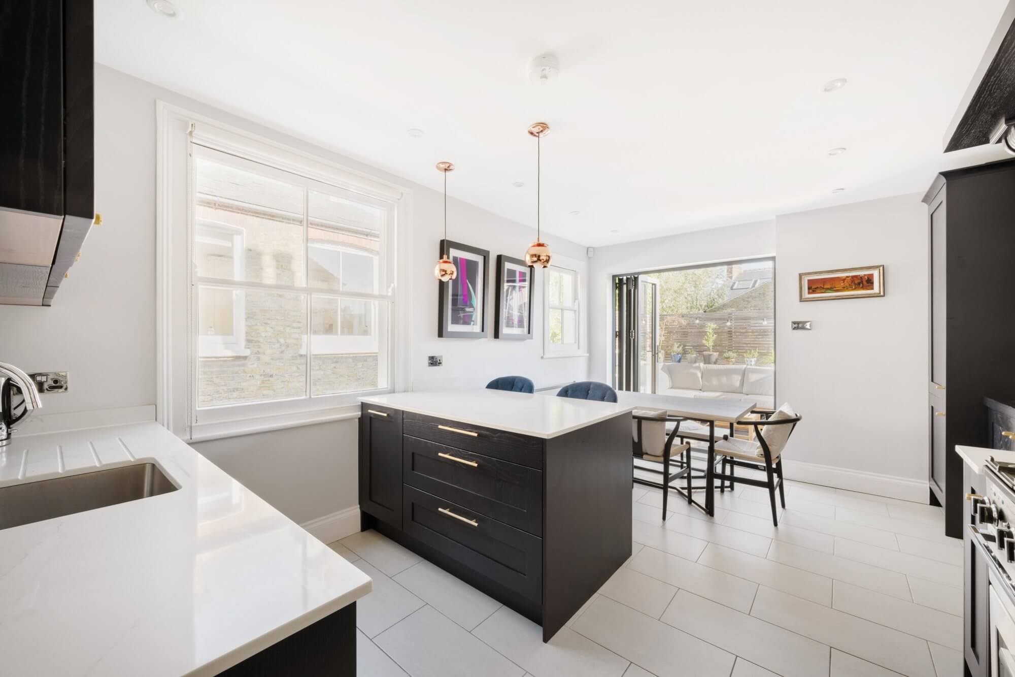 This beautifully presented home exceeds 1,090 Sq. Ft and offers an elegant blend of period charm and contemporary design. The spacious front reception room features a striking feature fireplace and expansive windows that bathe the space in natural light. A separate newly fitted kitchen/breakfast room showcases classic shaker-style cabinetry, integrated appliances, and space for dining—opening directly onto a private roof terrace, ideal for entertaining or relaxing.