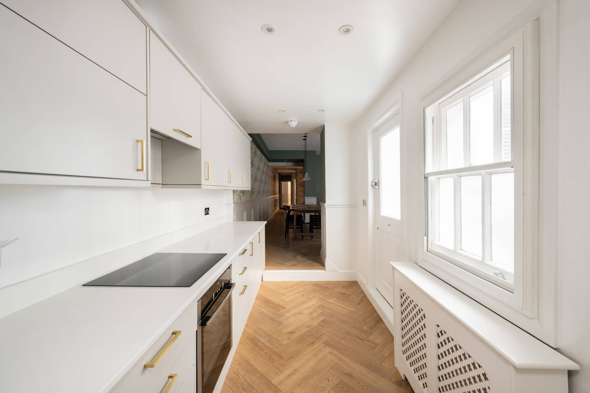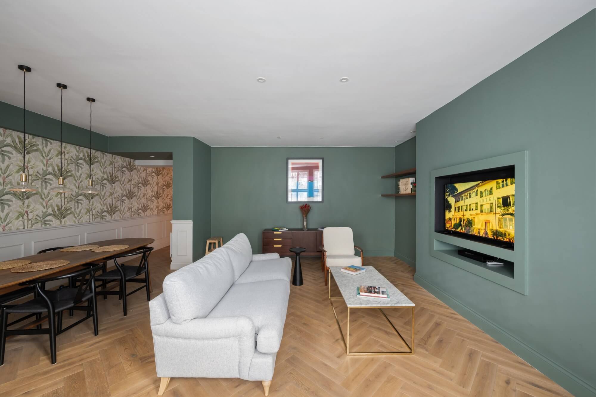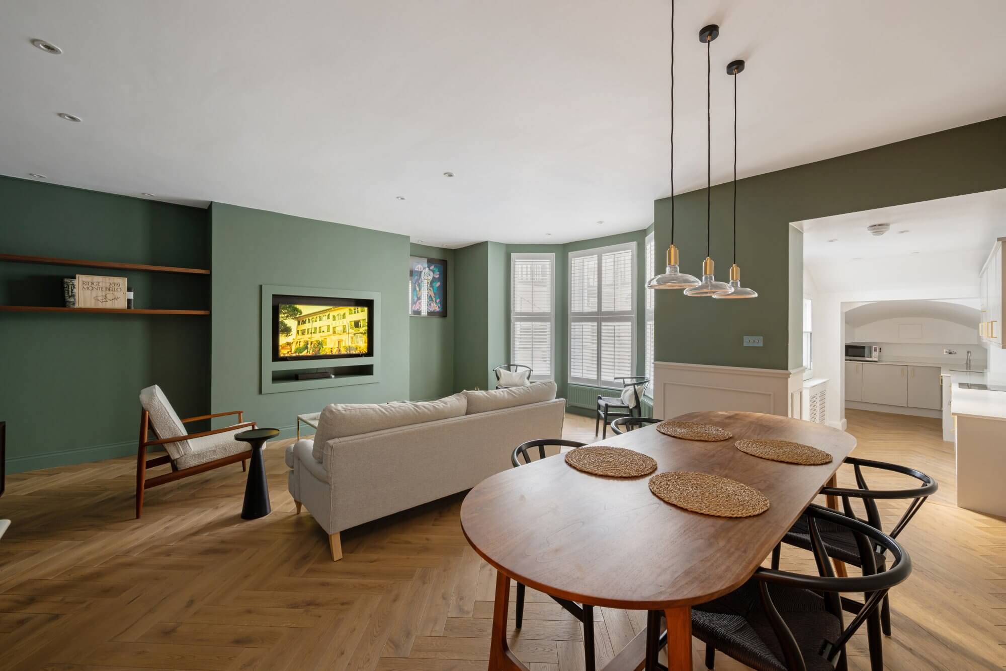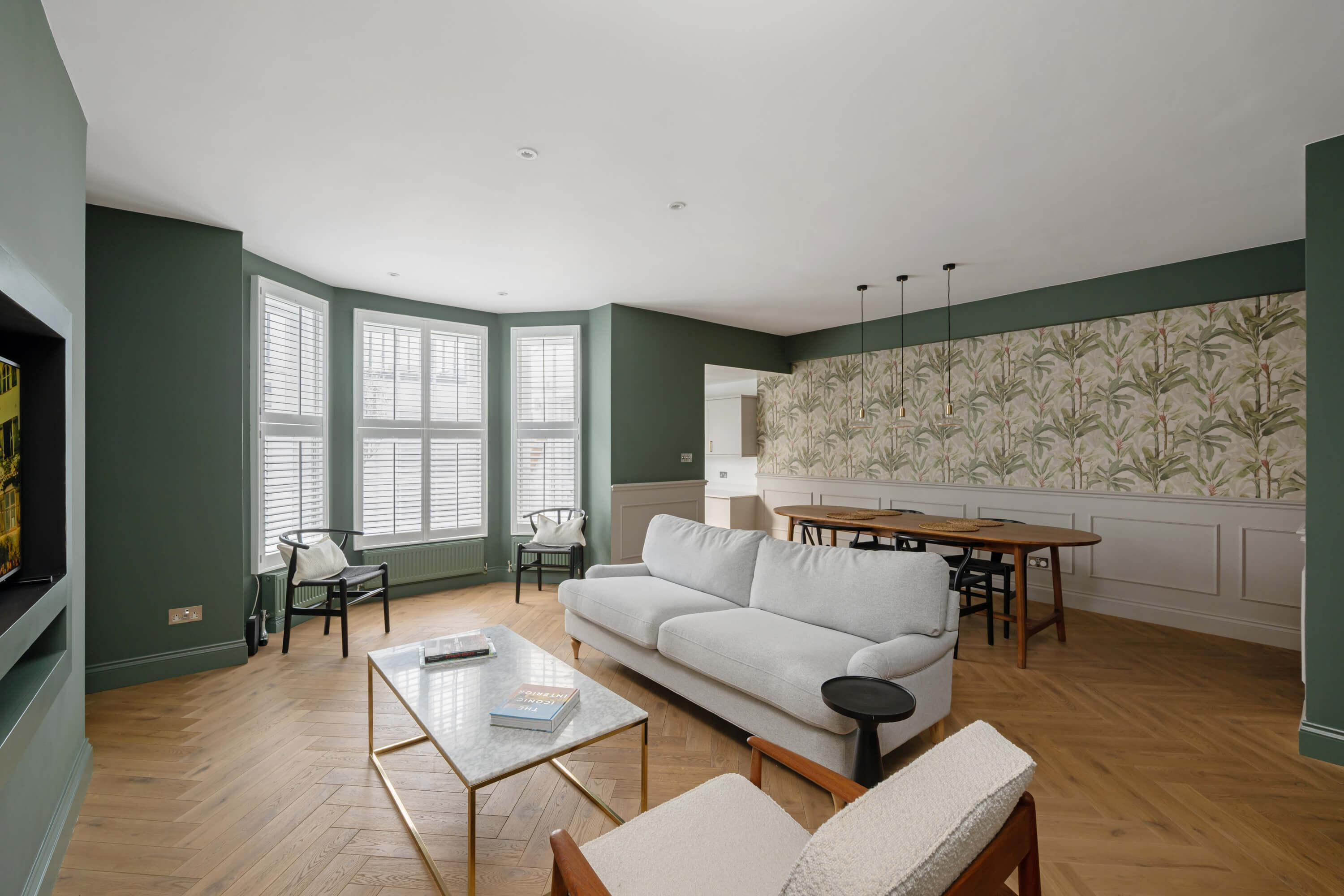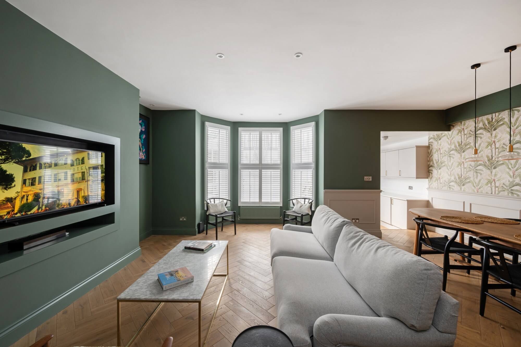At the heart of the home lies a superbly proportioned reception room, flooded with natural light from a wide bay window overlooking Gloucester Road. The space is anchored by elegant herringbone oak flooring, bespoke joinery and a carefully integrated media wall, creating a calm yet sophisticated setting for everyday living and entertaining.