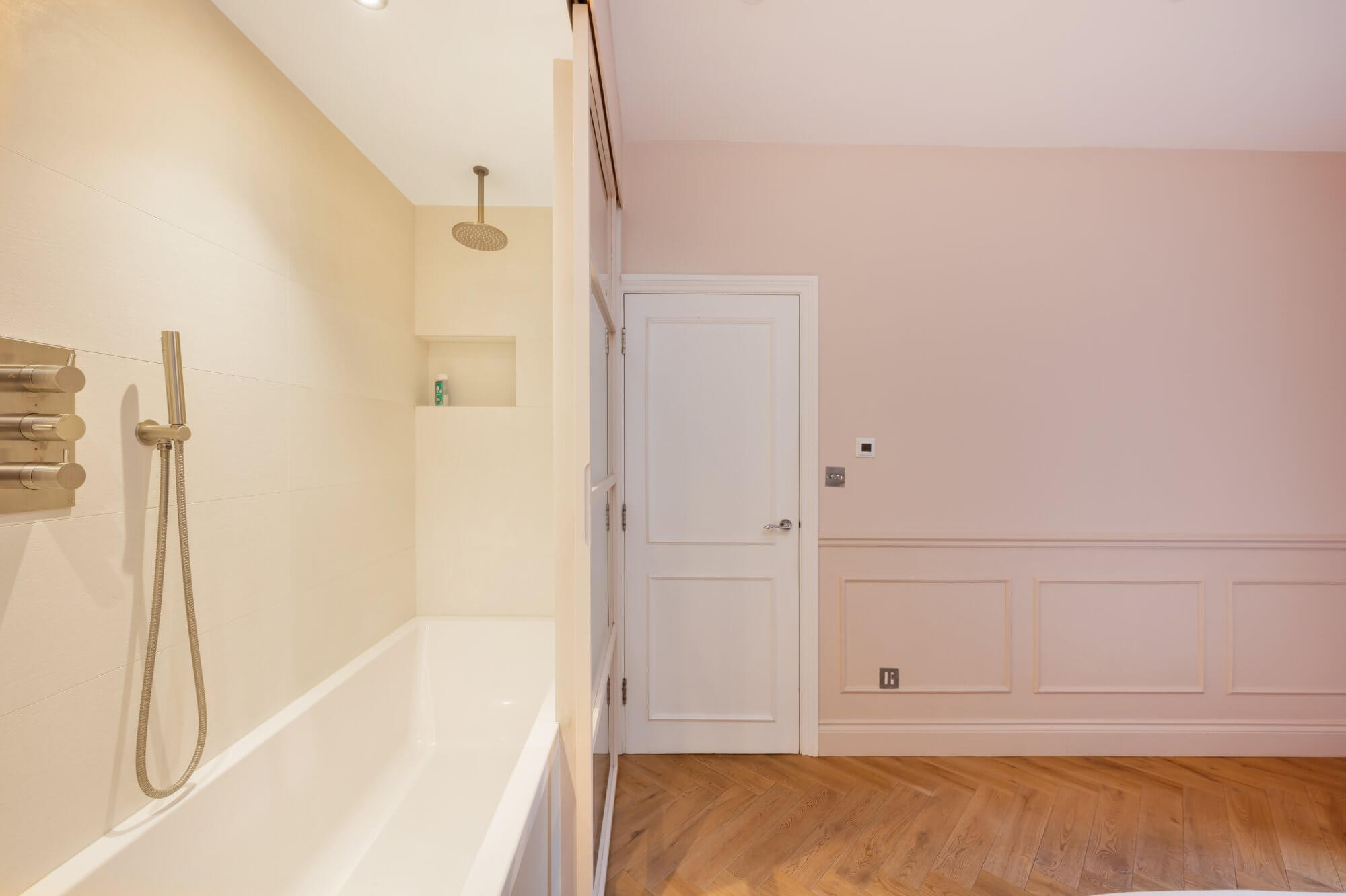 The principal bedroom suite offers a tranquil retreat, complete with bespoke built-in storage and direct access to a charming private patio garden—ideal for morning coffee or quiet outdoor moments. A stylish en-suite bathroom serves the principal bedroom, finished with high-quality fittings and a refined, modern palette. Two further double bedrooms are well proportioned and versatile, equally suited to guest accommodation, family living or use as a home office. These are served by a beautifully appointed family bathroom, finished to the same high standard as the rest of the apartment. There is access to the attractive courtyard garden from bedroom 3 / study, as well as from the rear hall.