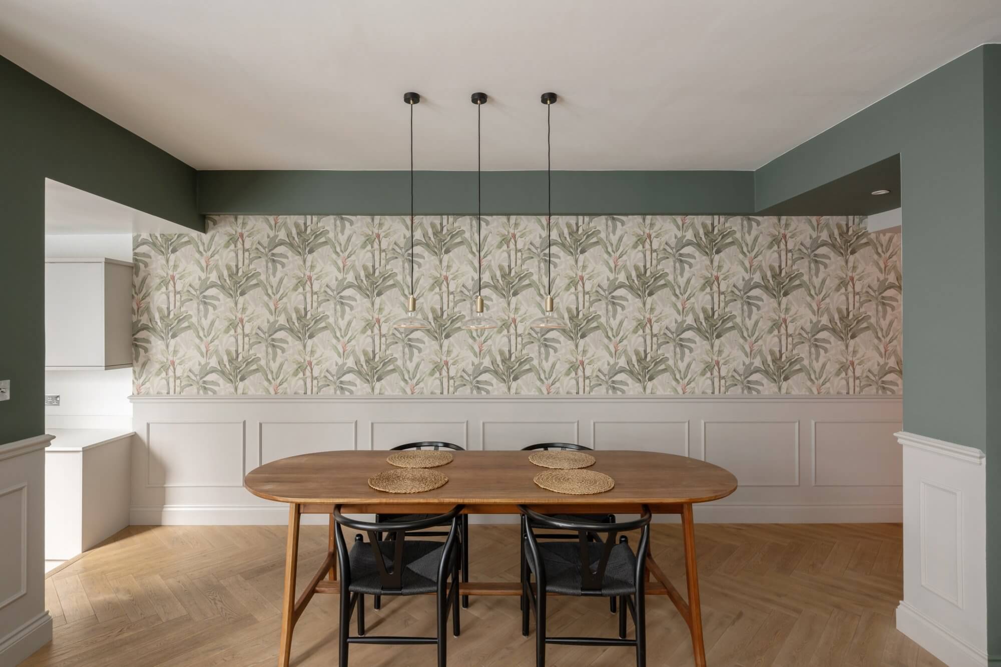 Adjoining the reception is a beautifully defined dining area, distinguished by fluted panelling and botanical detailing, which flows seamlessly into the kitchen. The contemporary kitchen has been designed with both form and function in mind, featuring clean-lined cabinetry, arched detailing, crisp white surfaces and refined brass accents. The result is a space that feels architectural, elegant and effortlessly practical.