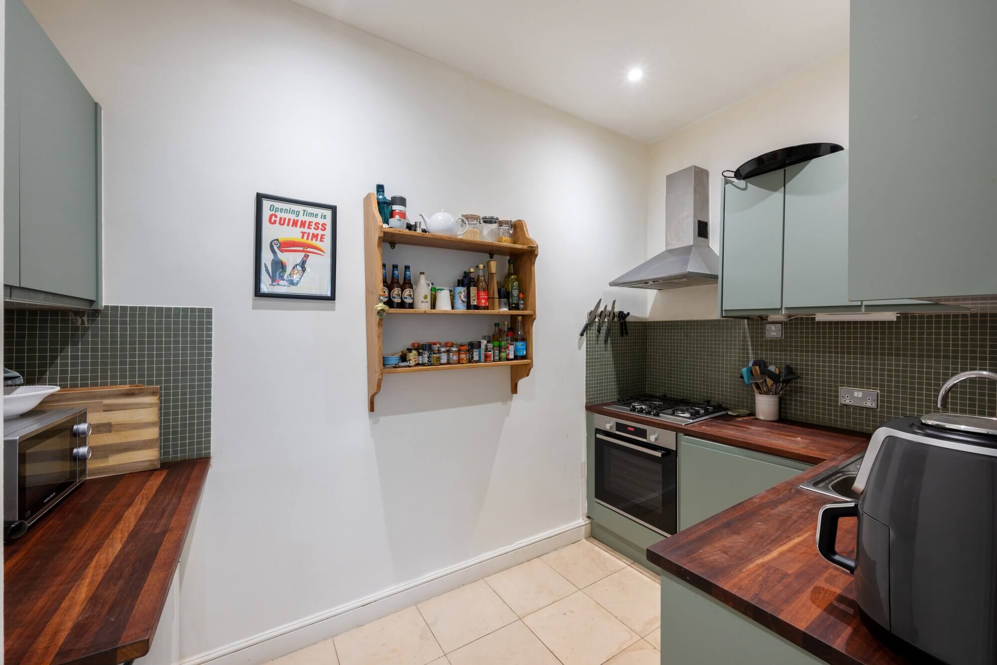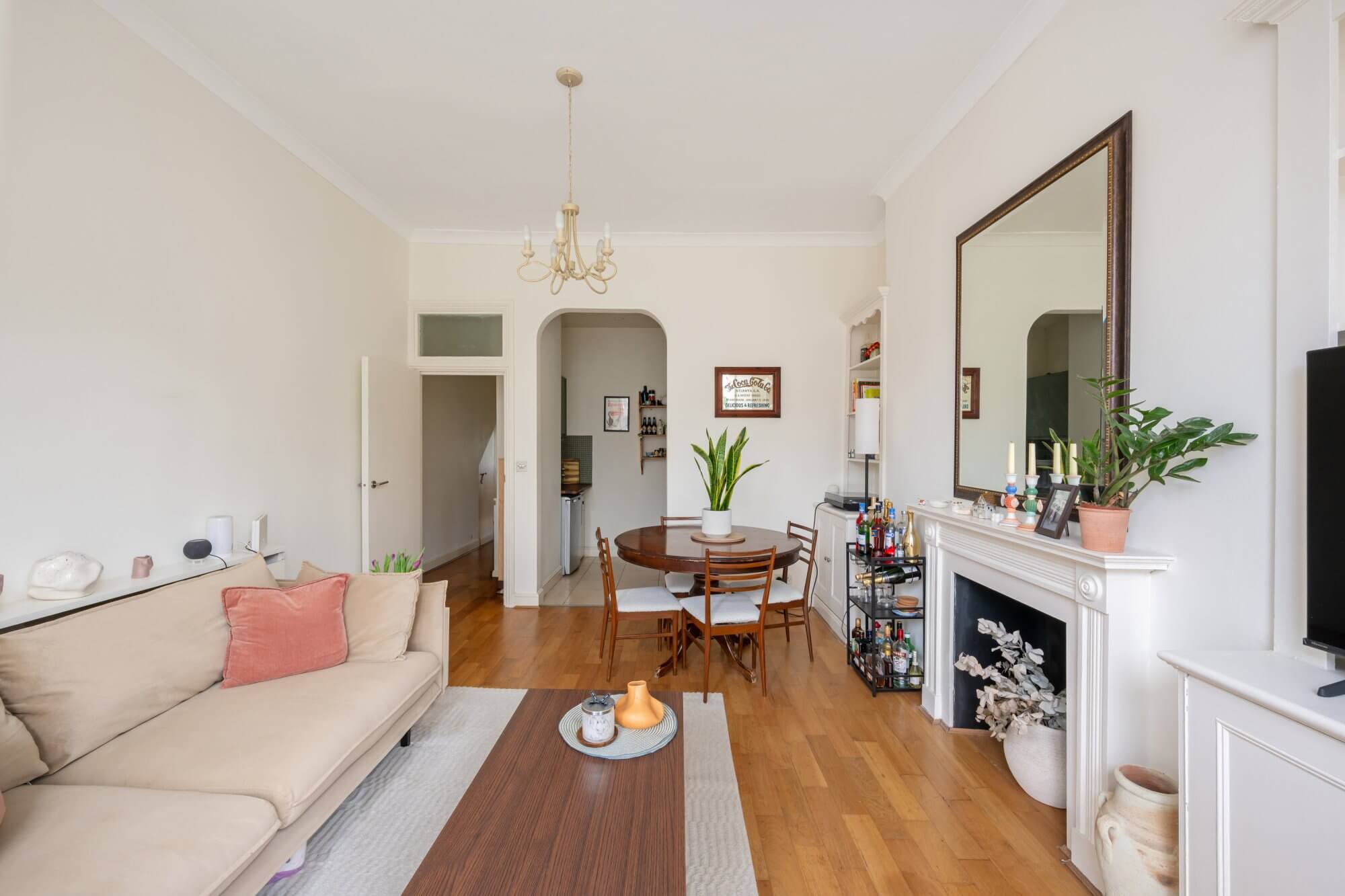 The reception and dining room sits to the front, and provides ample room for both seating and dining. The separate kitchen is positioned centrally, well arranged and practical, while the layout ensures a clear division between living and sleeping areas. To the rear are two bedrooms. The principal bedroom is particularly well proportioned and benefits from built-in wardrobes. A second double bedroom provides flexibility for guests, a study or nursery. The bathroom is set off the hallway, serving both rooms with ease.