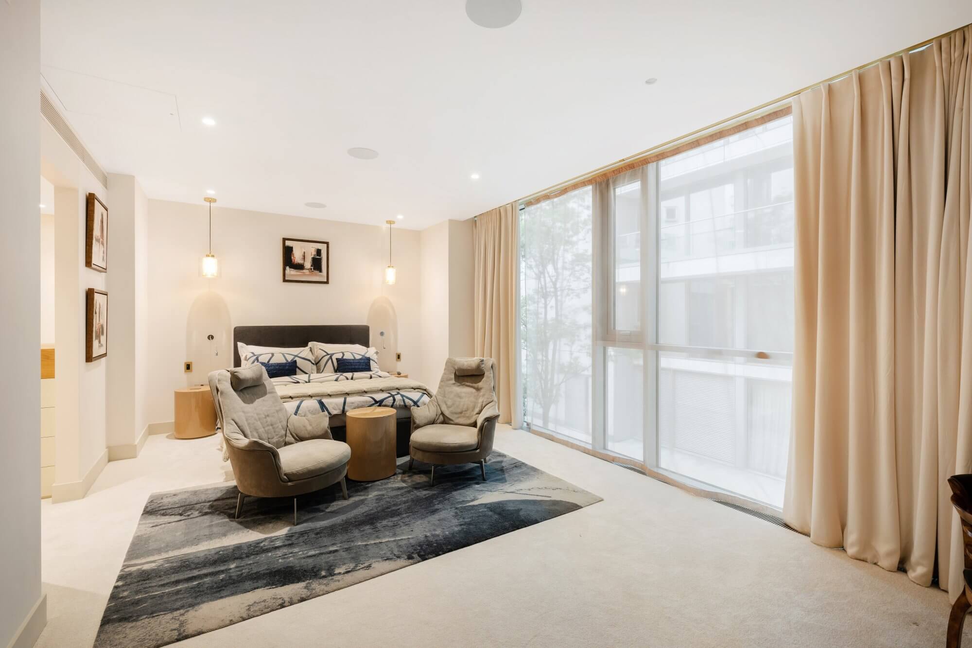 The first floor is dedicated to a spacious and well-appointed principal bedroom suite, benefitting from excellent natural light through full-height glazing. The suite incorporates a defined sleeping area, a generous walk-in wardrobe, and a modern en-suite bathroom, creating a calm and private retreat.