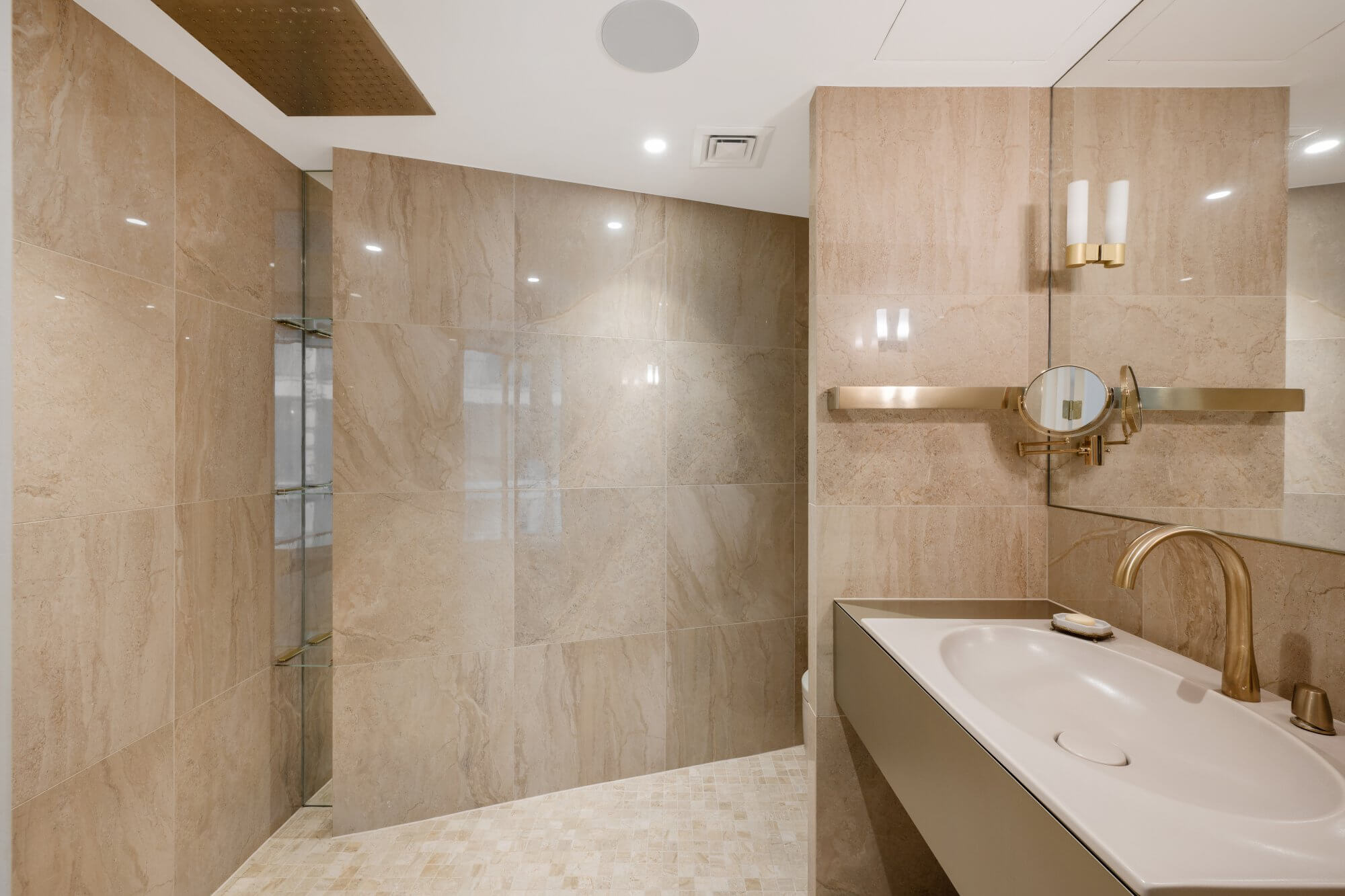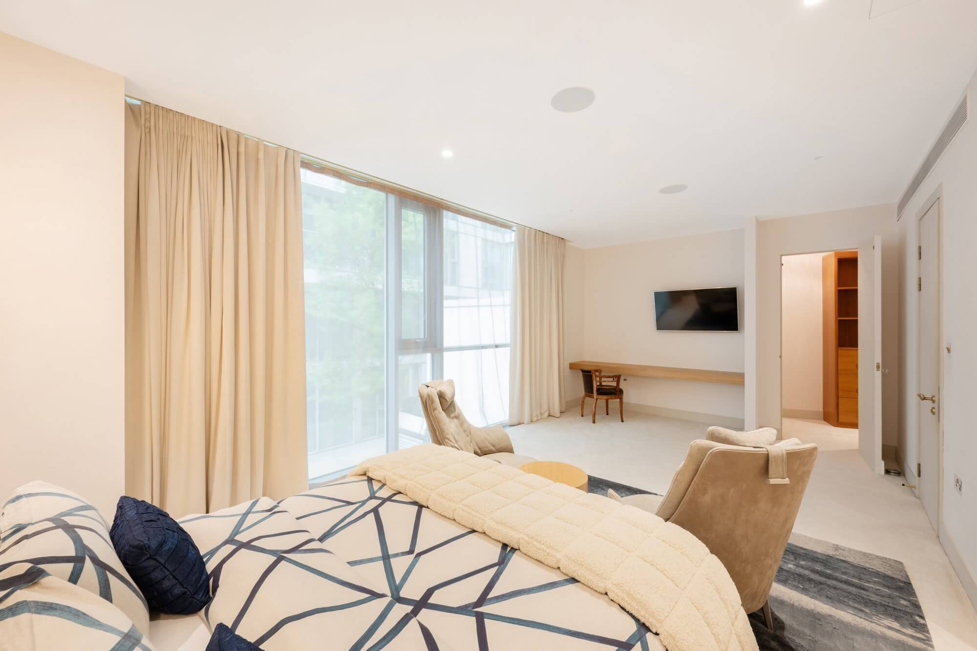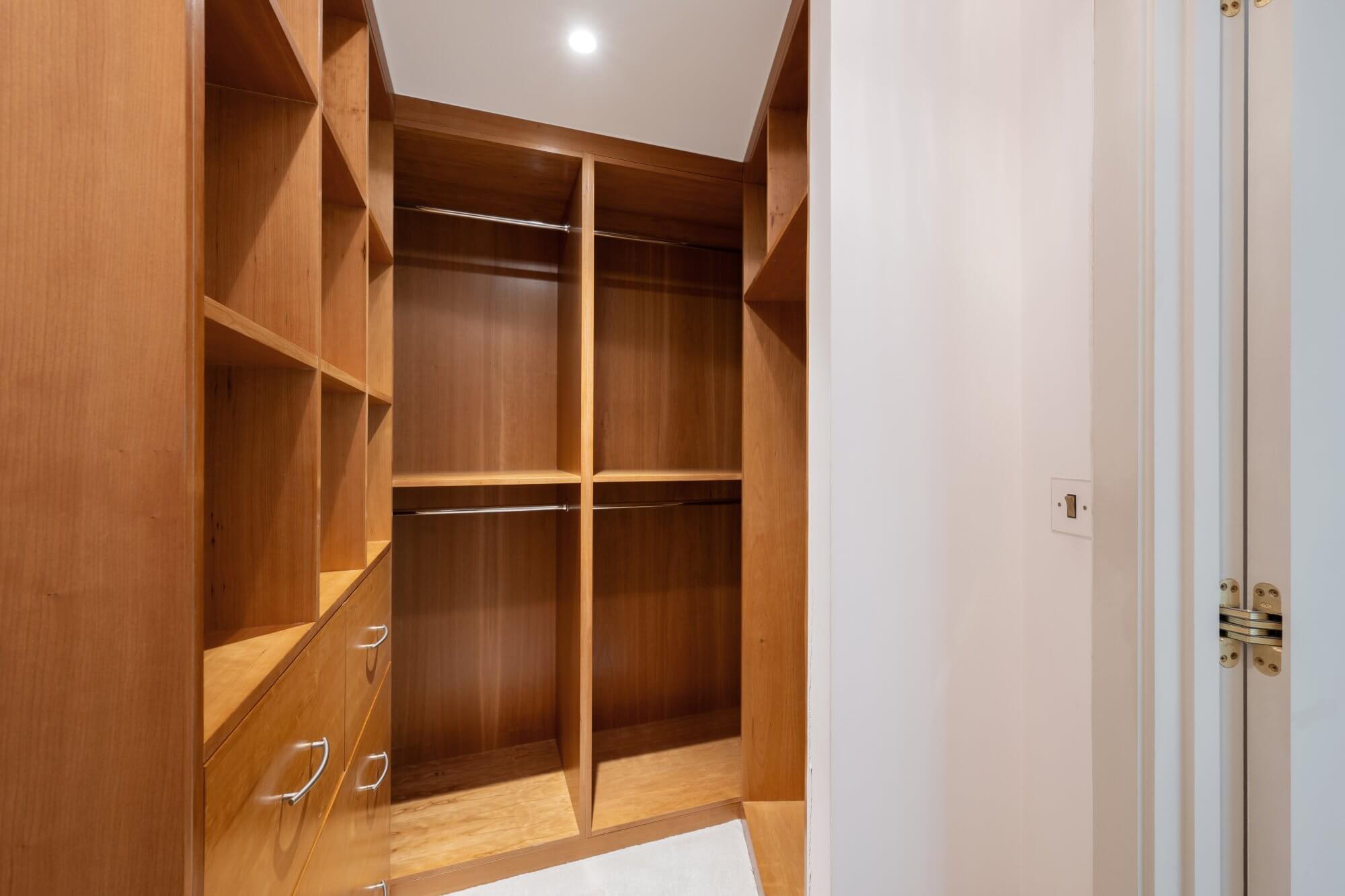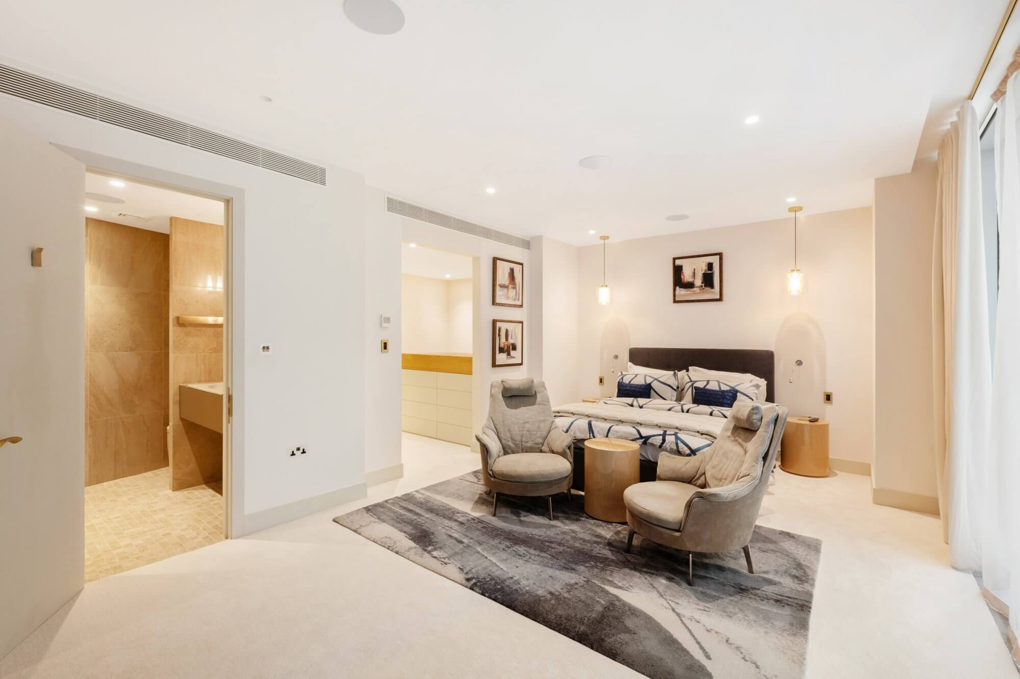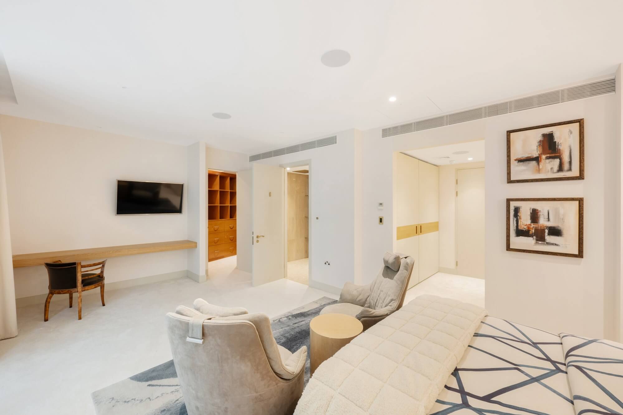 Additional built-in storage and thoughtful planning ensure the space is both elegant and highly practical, with flexibility for a study or seating area if required.
