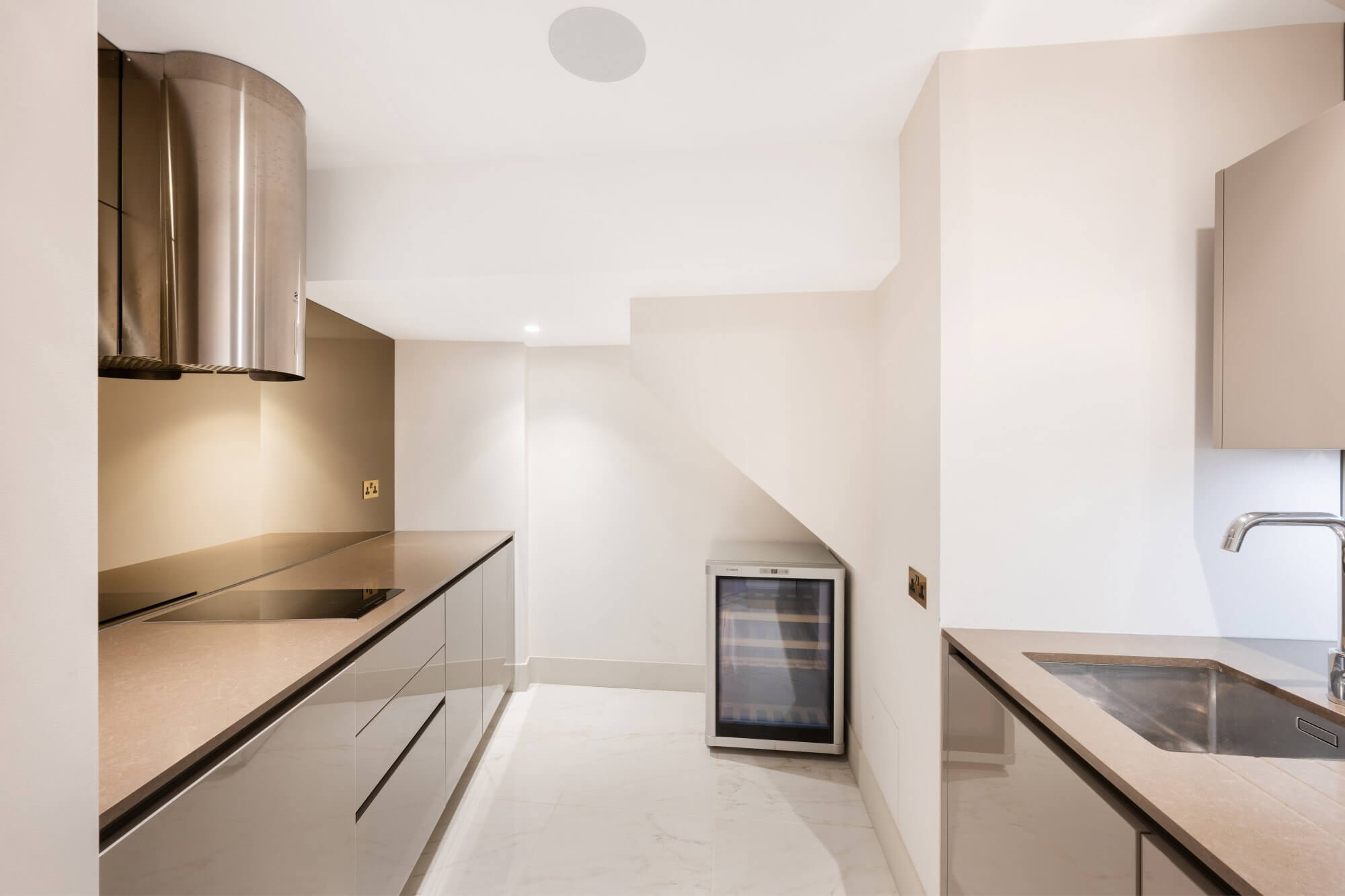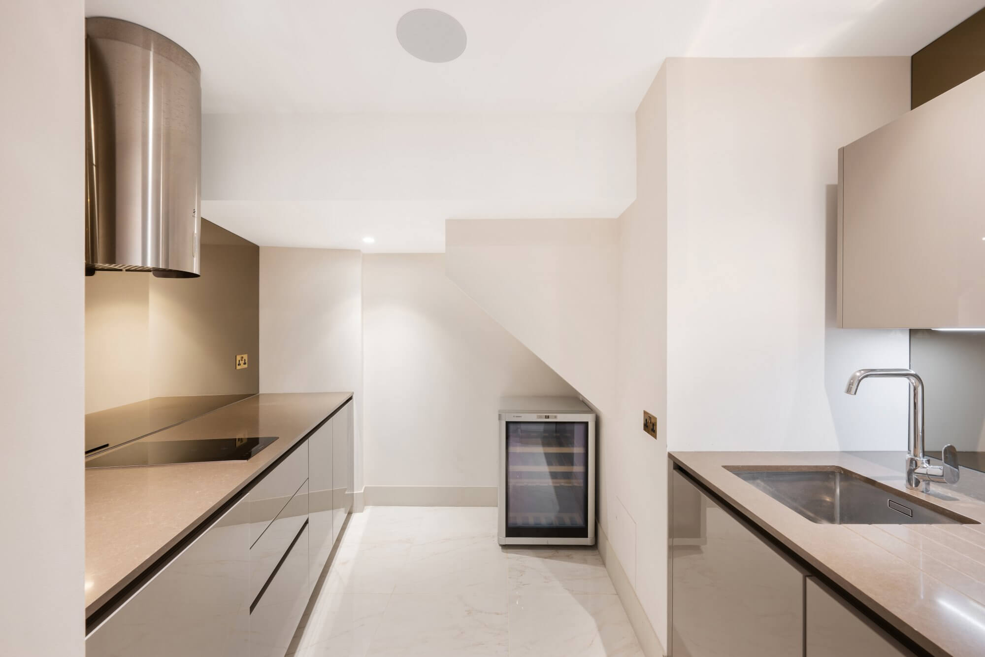 The kitchen is positioned to the rear, offering a practical and efficient layout with contemporary cabinetry and integrated appliances, upgraded approximately 7–8 years ago. A guest cloakroom and additional storage are discreetly arranged off the central hallway, ensuring functionality without compromising the clean architectural lines of the space.