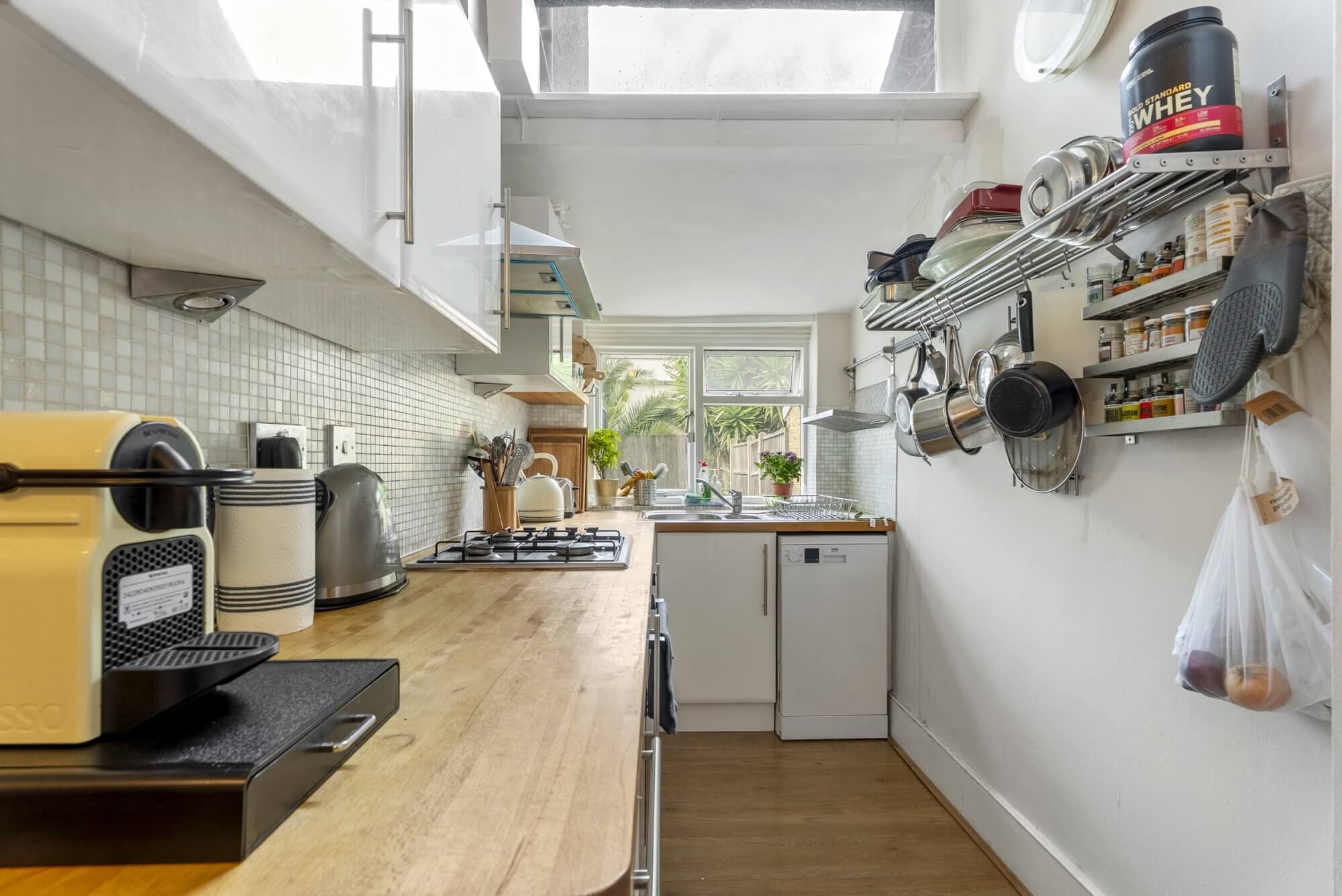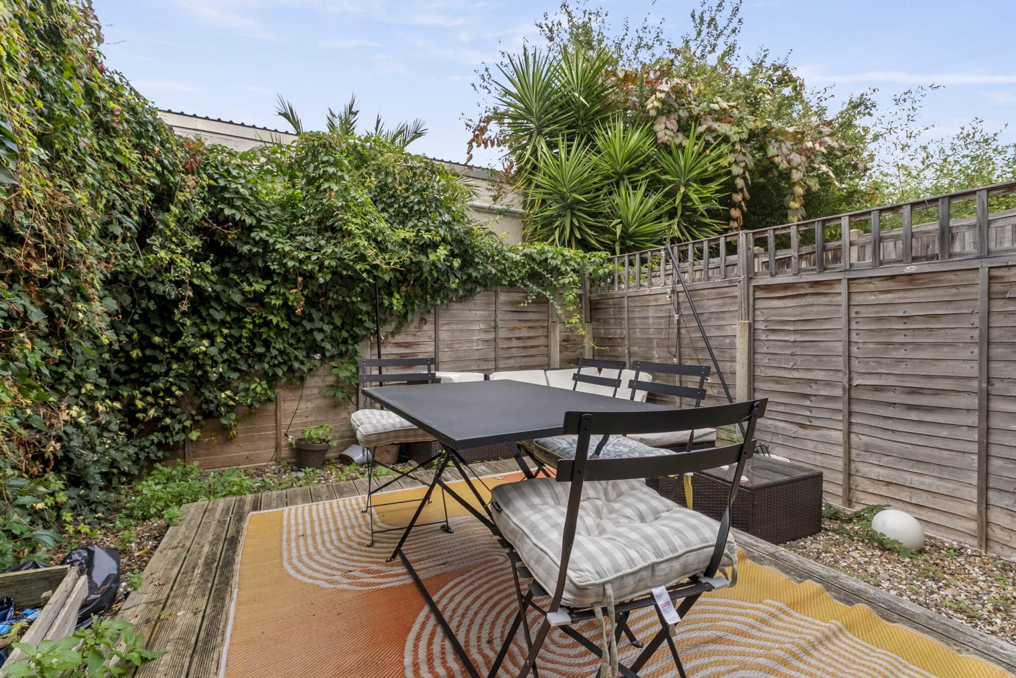 The heart of the home is the stylish eat-in kitchen, thoughtfully equipped with premium appliances and modern conveniences. To the rear, a sophisticated reception room, complete with an elegant two-piece suite, opens seamlessly onto a private landscaped garden—an inviting sanctuary for relaxation or entertaining.