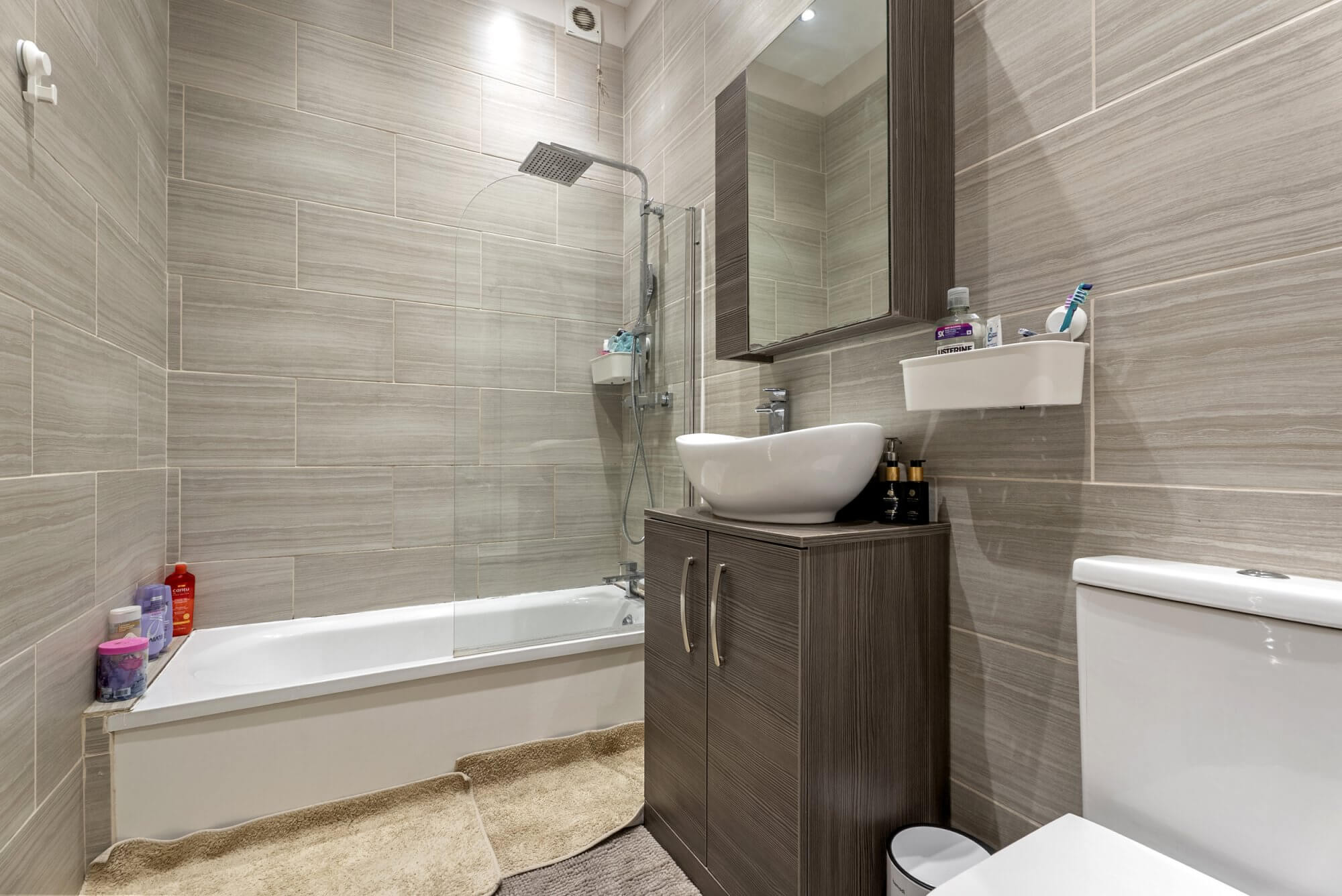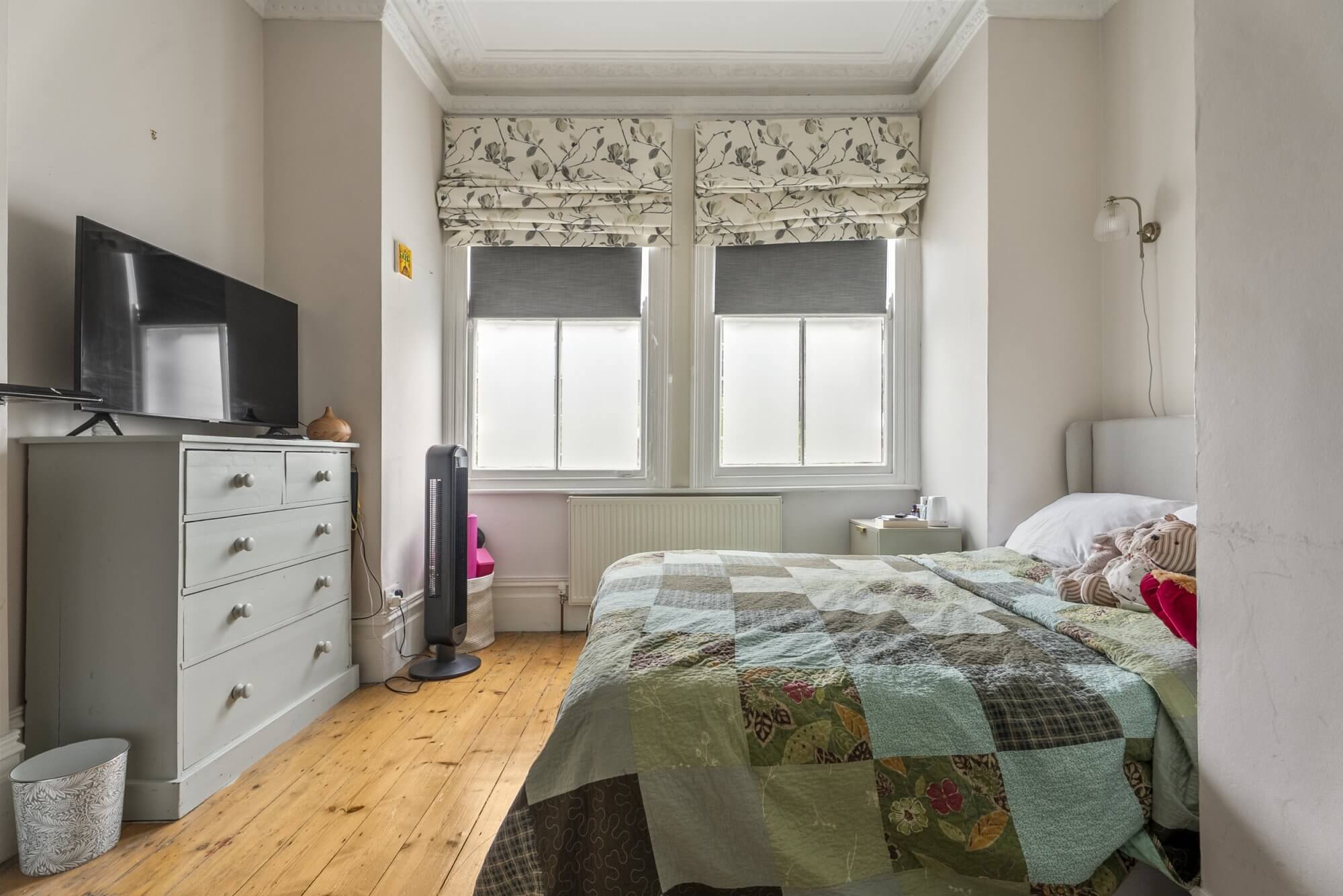 The generous front-facing bedroom boasts a statement bay window, original mantelpiece, and abundant fitted storage, complemented by a sumptuous double bed. A contemporary, fully tiled bathroom follows, designed with sleek finishes and elegant detailing.