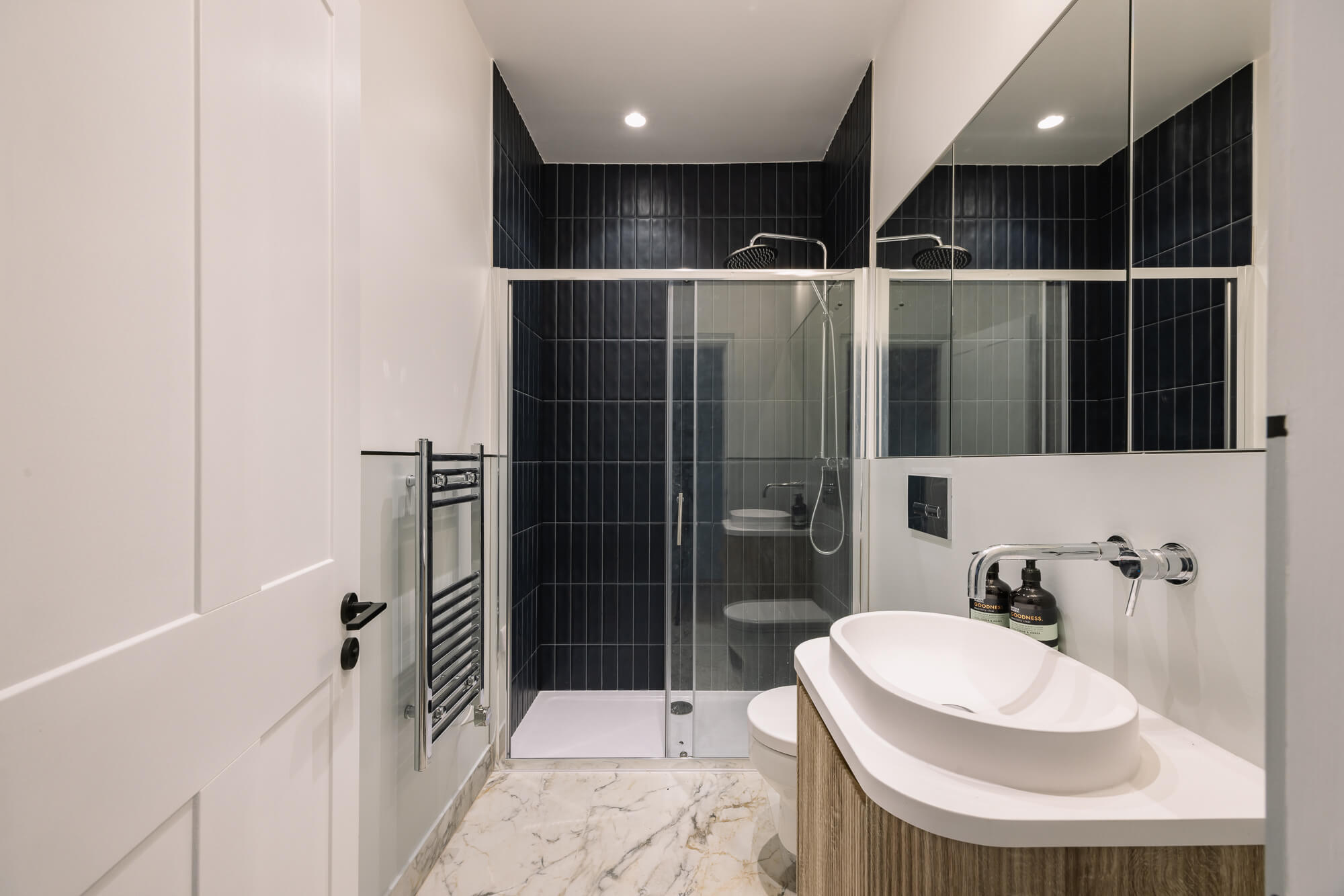 There are two well-proportioned bedrooms, each finished in neutral tones to maximise light and space. The principal bedroom comfortably accommodates a double bed and storage furniture, while the second bedroom is ideal as a guest room, home office or study. The contemporary shower room is finished to a high standard, featuring a large walk-in shower, vanity basin, WC and modern tiling.