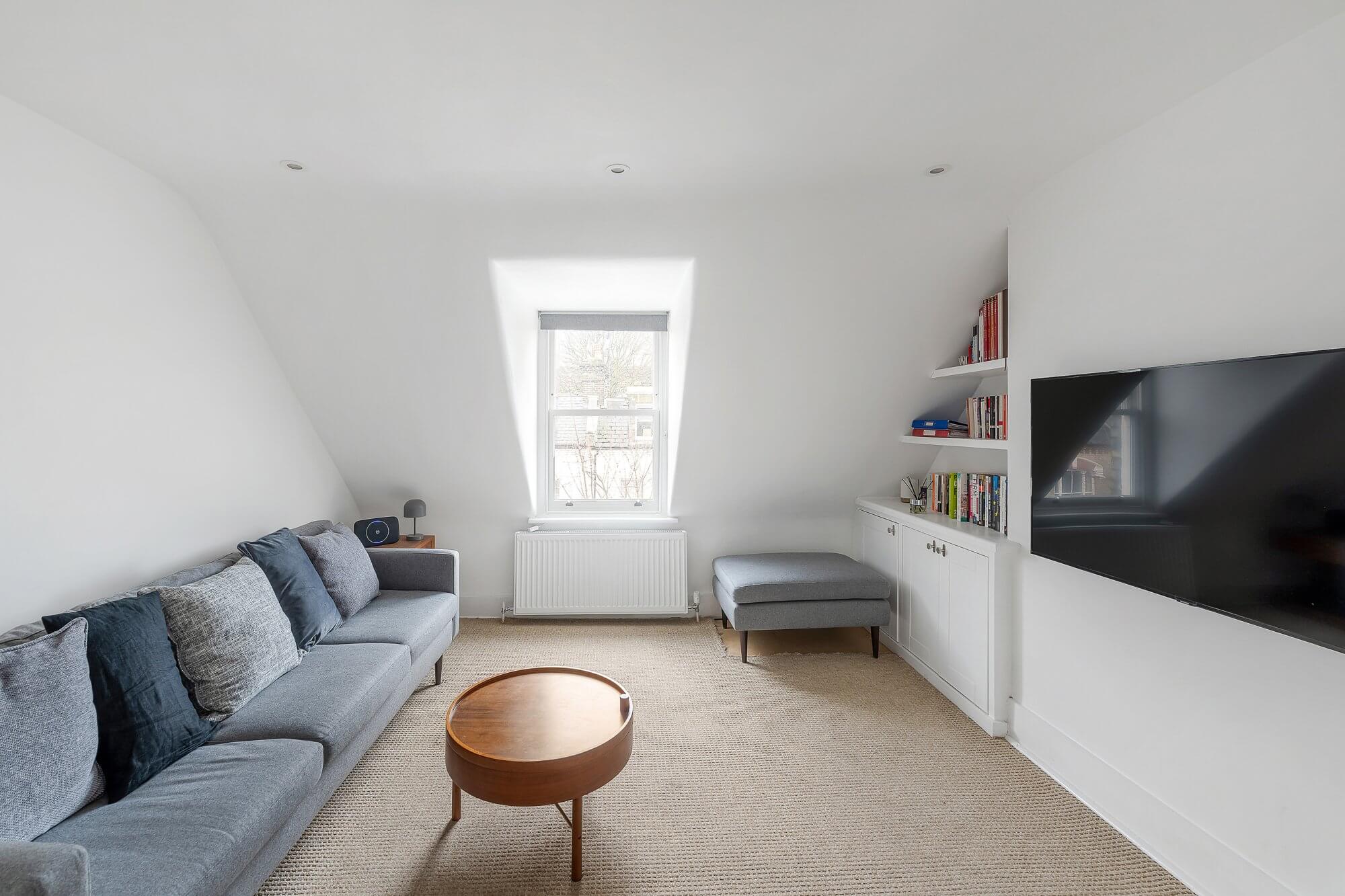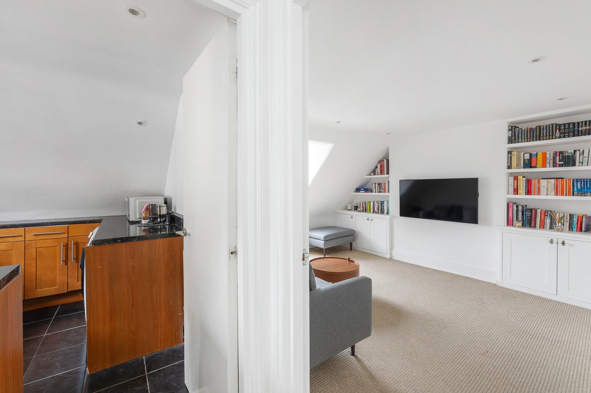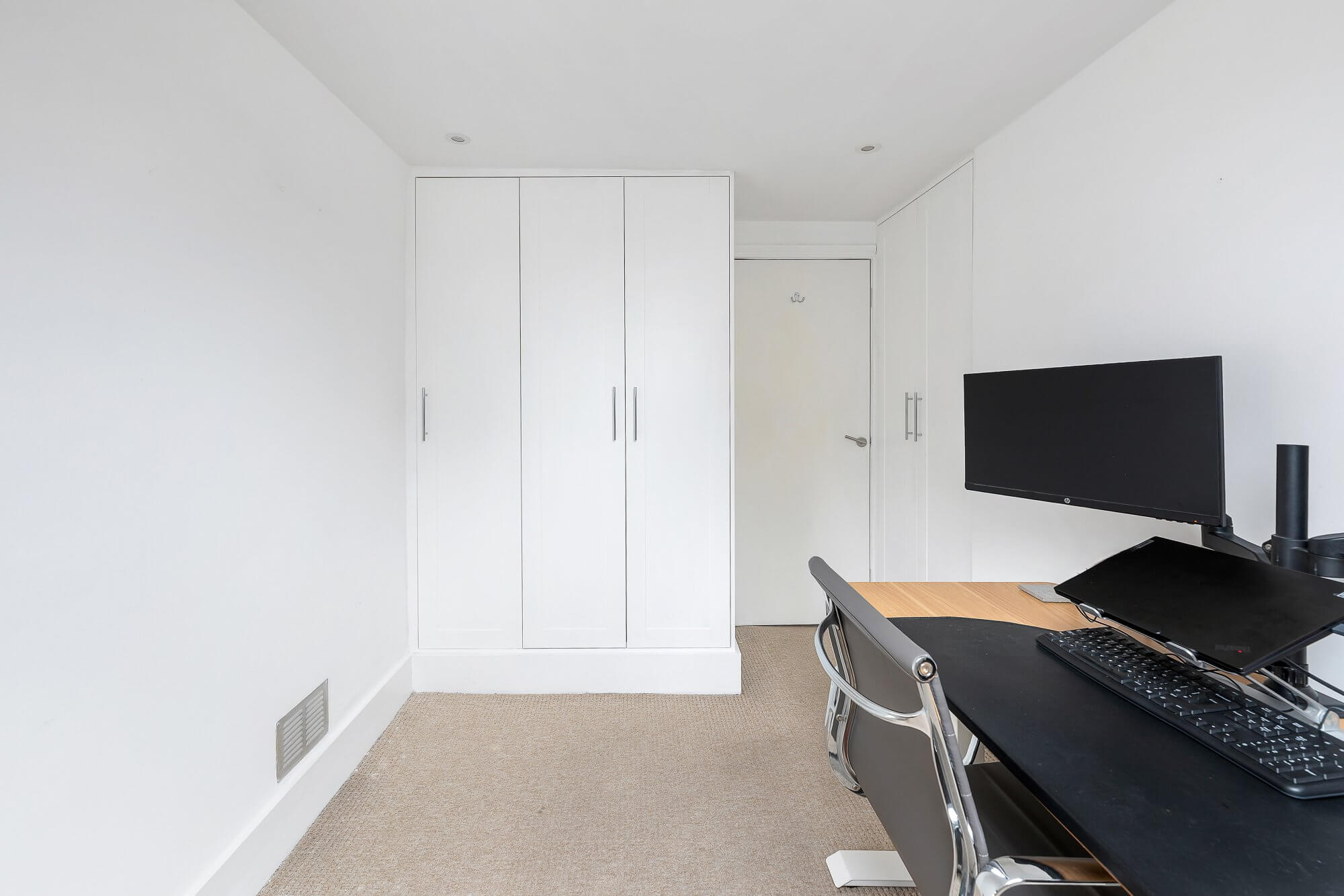 The property includes a generous principal bedroom and a second bedroom, currently arranged as an office, making it ideal for home working or occasional guests. A modern family bathroom completes the accommodation. Positioned on the top floor, the apartment benefits from excellent natural light, a good sense of privacy and well-considered storage throughout.